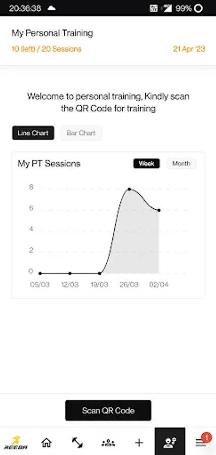 Checkin: Using the Reeba app, scan the QR code to enter the gym. The app also allows you to check-in for your personal training sessions and fitness classes.