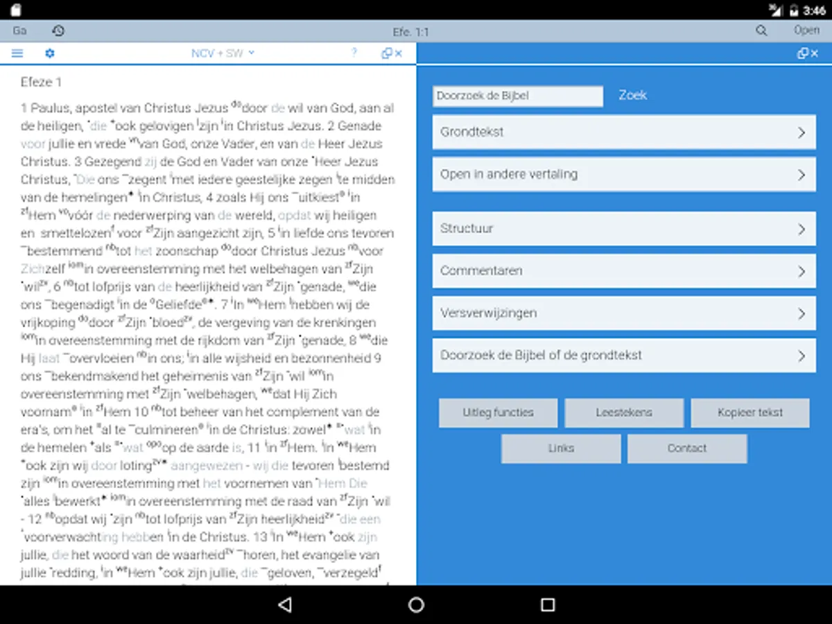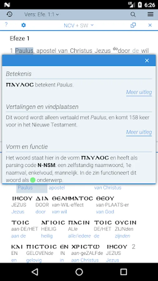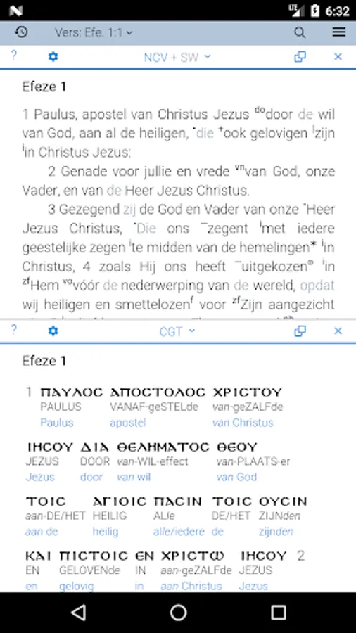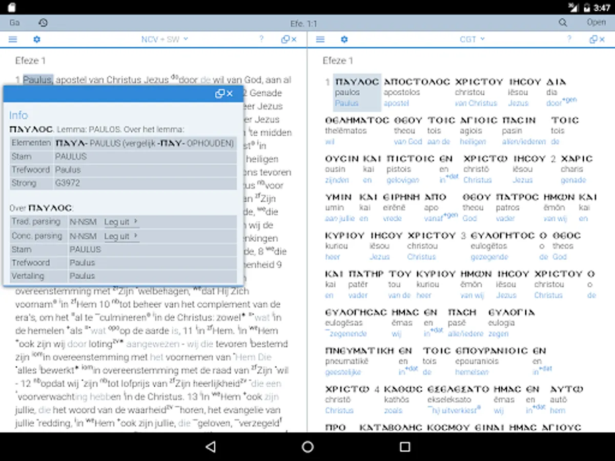 With the NCV Bible app you have all the tools for your Bible studies. It contains the Dutch Concordant translation, which is a very literal translation of the original text. Click on a word for additional information about this word and to consult dictionaries. You can also view the interlinear - the Greek text below each word the literal meaning and other information about that word. All to investigate "what is written." Other translations and texts can be downloaded separately.