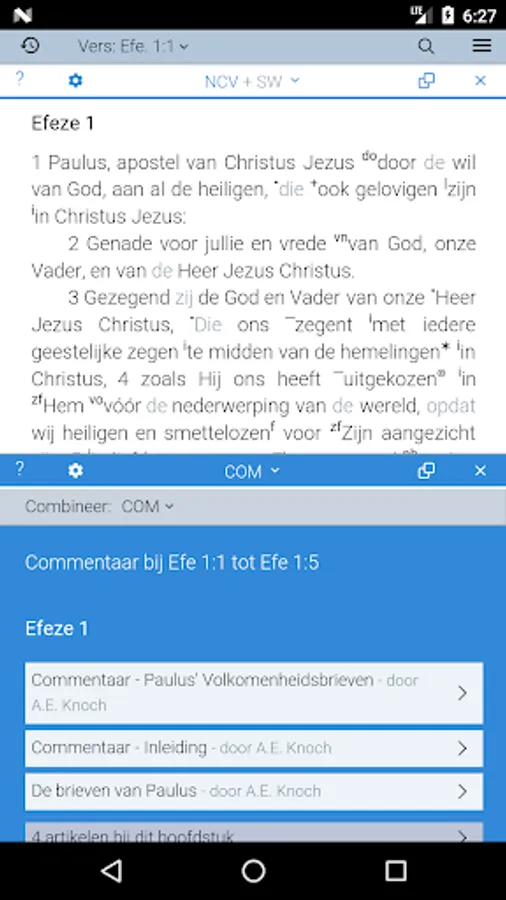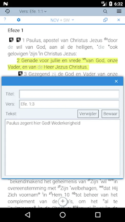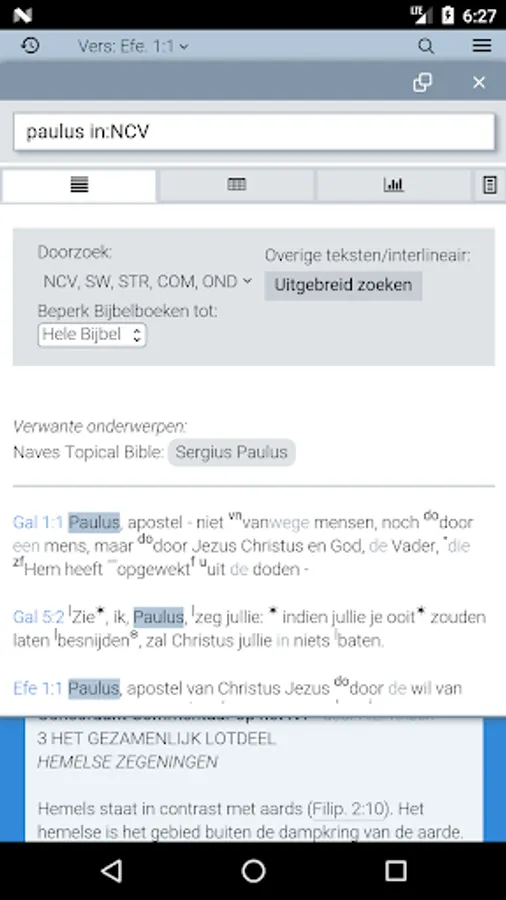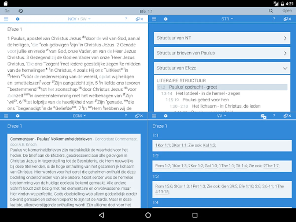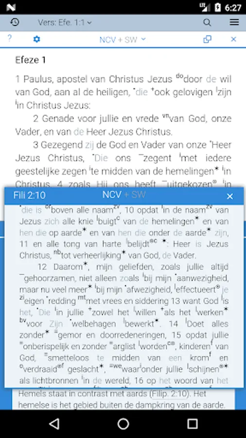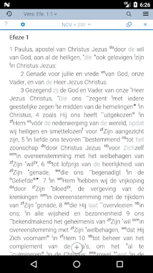 With the NCV Bible app you have all the tools for your Bible studies. It contains the Dutch Concordant translation, which is a very literal translation of the original text. Click on a word for additional information about this word and to consult dictionaries. You can also view the interlinear - the Greek text below each word the literal meaning and other information about that word. All to investigate "what is written." Other translations and texts can be downloaded separately.