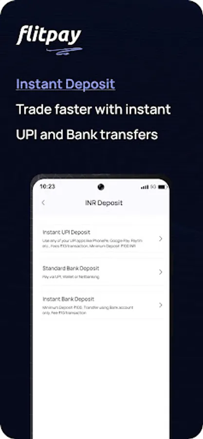 Instant Deposit and withdraw INR - Flitpay lets you deposit and withdraw INR using UPI, IMPS, NEFT, or RTGS automatically.