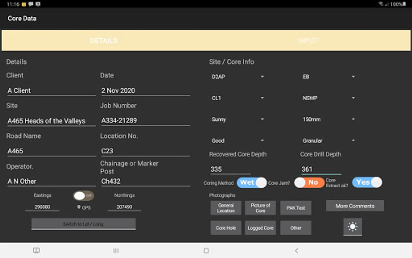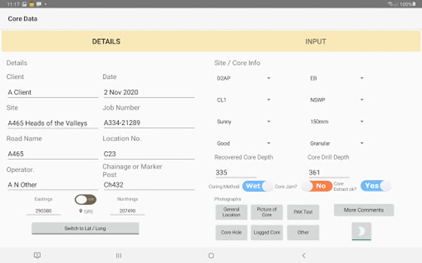 CoreDATA features both Roadside Record Sheet and Core logging software . As soon as data is inserted into the CoreDATA workspace, the file can be uploaded into the logging desktop software and its final layout is updated real-time.