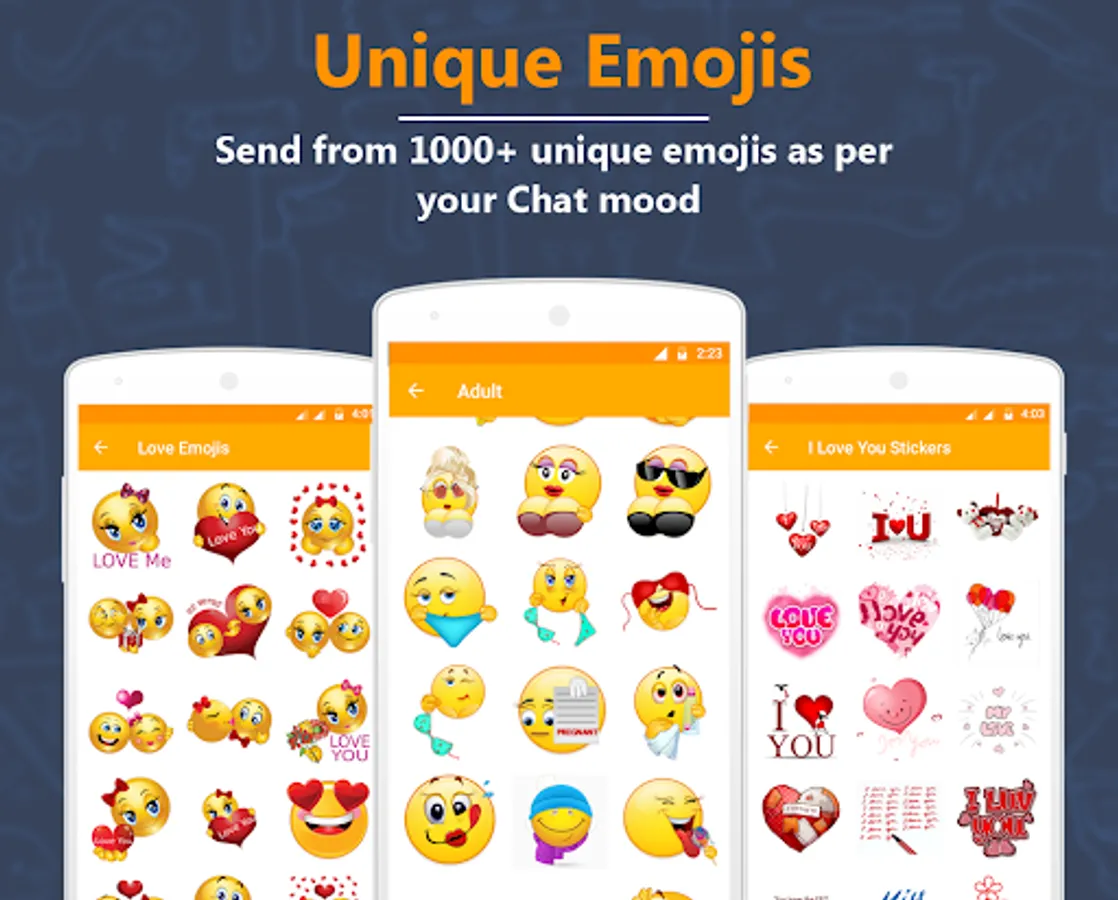 It's better to express your feelings with emojis than text, that's why we are here to give you real love emojis experience. We are sure you will never be bored from flirty emojis texting. Collection of love & adult emojis app is classic instead of regular emojis and a new way for all adults to make their texting into sexting. Love Emoticons & Adult Emojis app provide 1000+ emojis in different categories like smiley, adult, love, dirty, romance, texting, valentine emojis, teddy love emojis and heart emojis. You can fire your girlfriend/boyfriend with adult texting with love emojis. Love Emoticons & Adult Emojis send all emojis as Images in all kinds of messaging applications like WhatsApp, Facebook, SMS, WeChat, Skype etc.