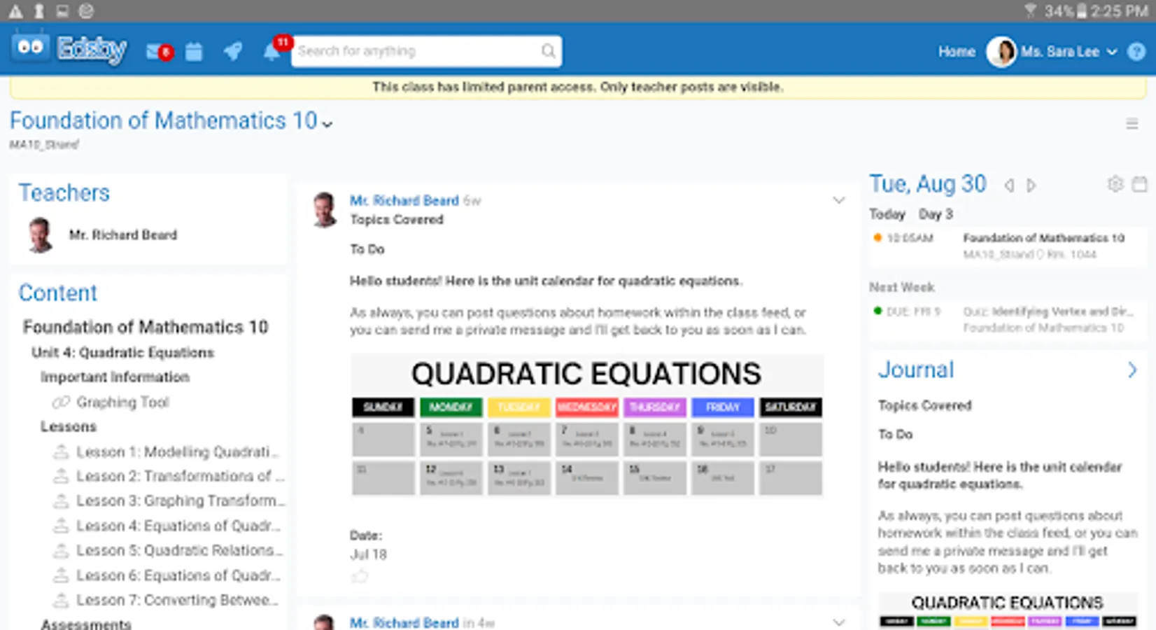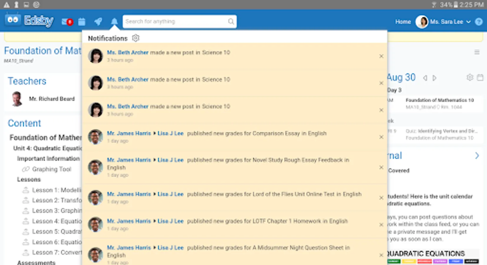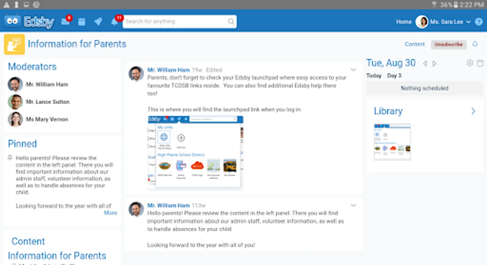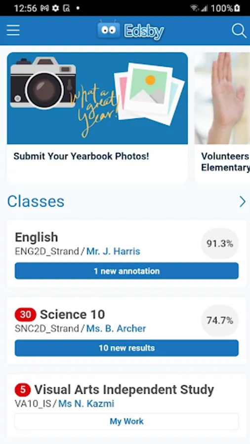 The Edsby app has many of the capabilities of the main Edsby web browser interface. Some complex features for certain types of users, such as the Edsby gradebook used by teachers, aren't available on devices with small screen sizes.