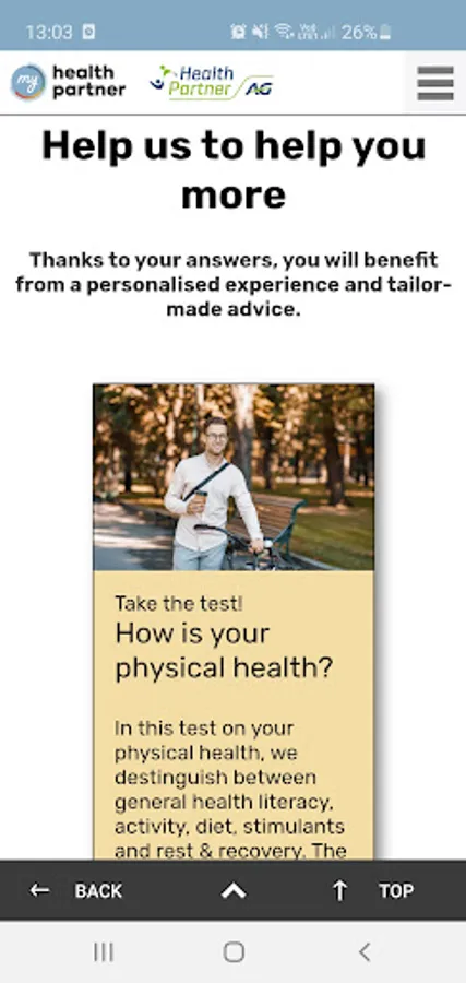 A healthy lifestyle from A to Z? With My Health Partner, it doesn’t have to be difficult! This app supplies useful advice, handy tips and scientifically sound information. A total experience designed just for you and your physical and mental health!