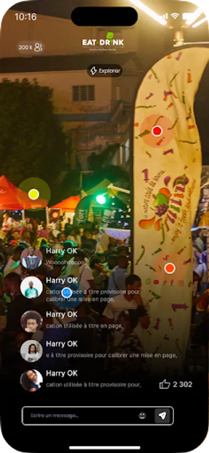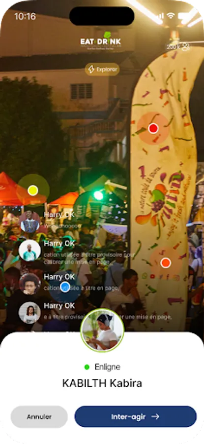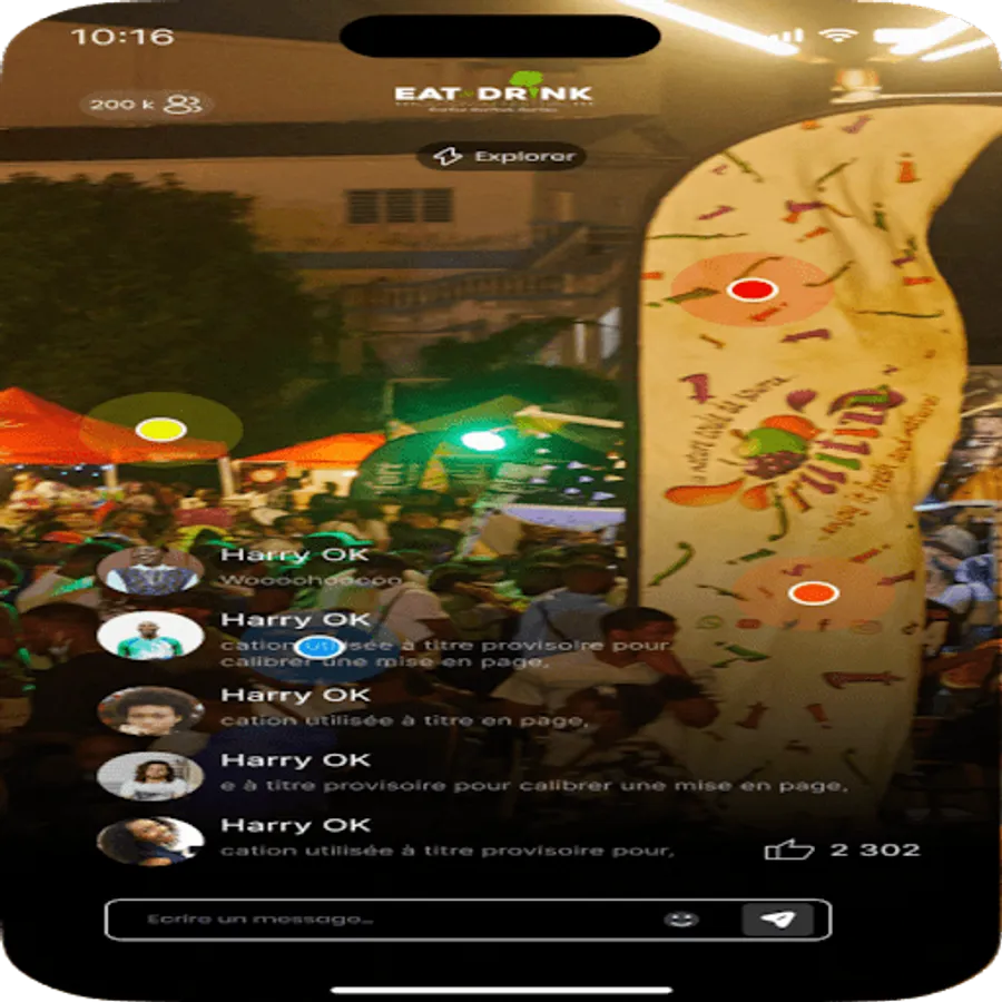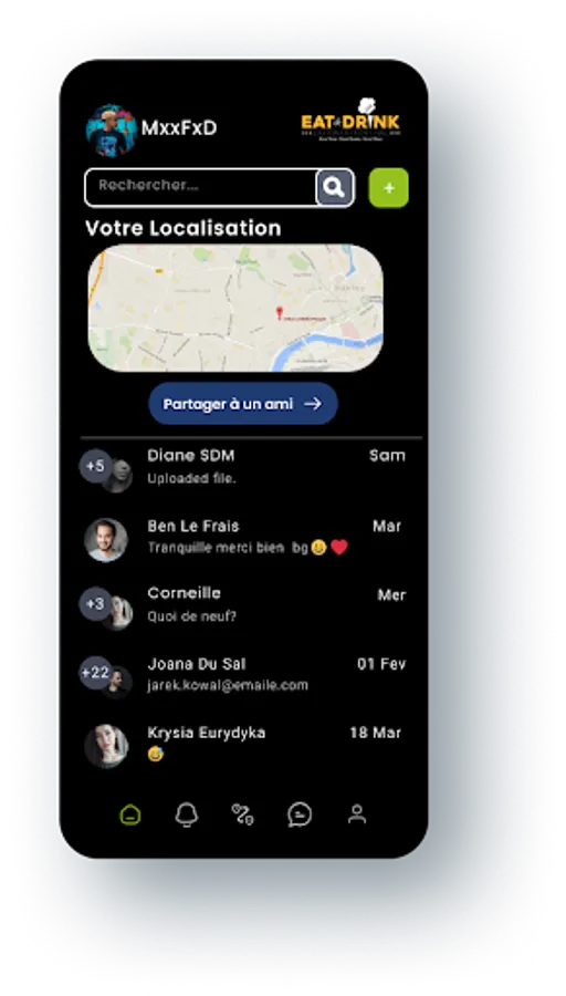 With our chat application, you will be able to easily orient yourself on the festival site thanks to the different geolocated zones of the festival, visit the restaurants present online and even order from your home or your workplace all the menus offered on site on the festival venue and have it delivered to you.