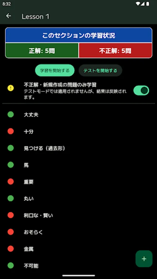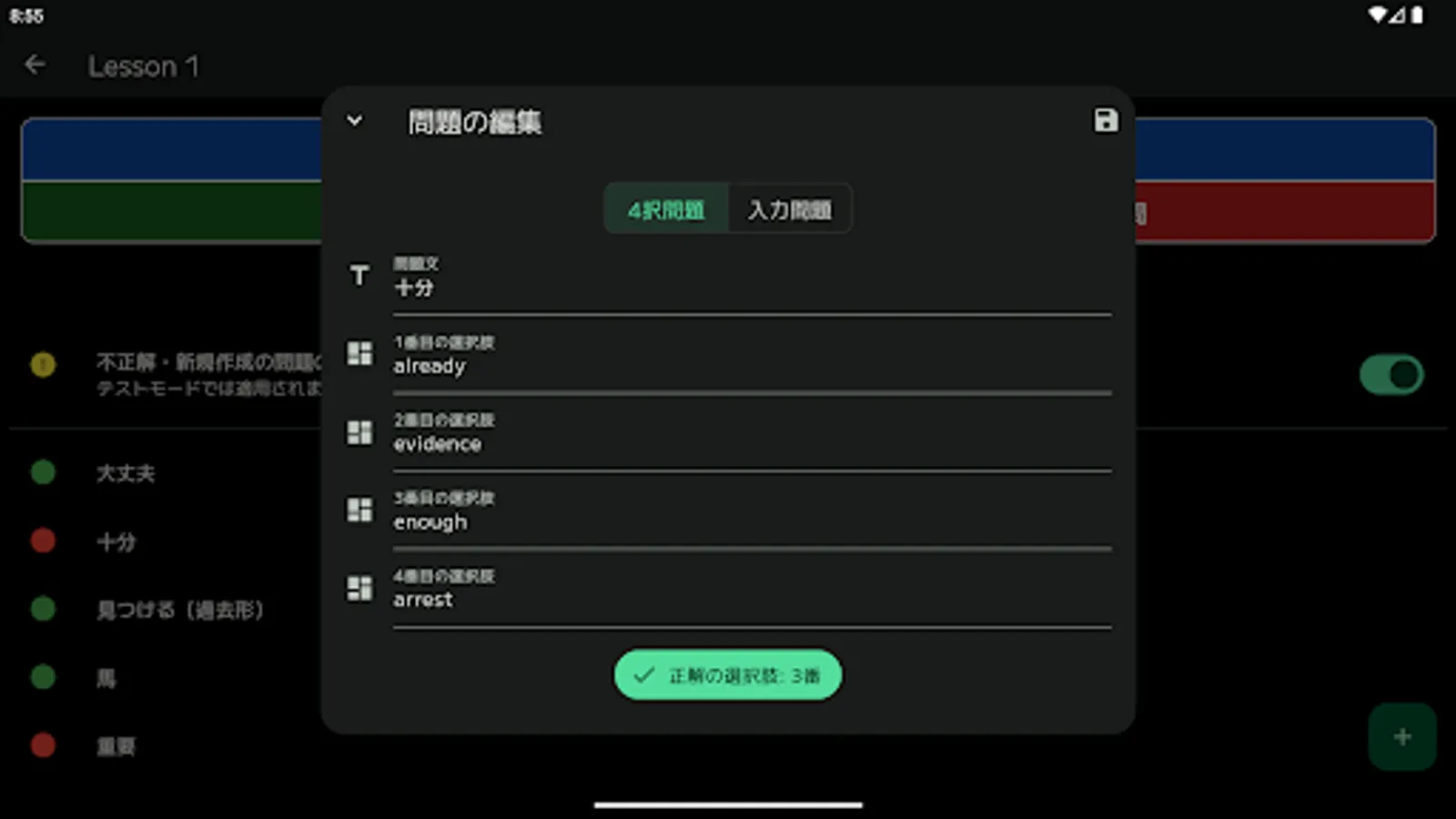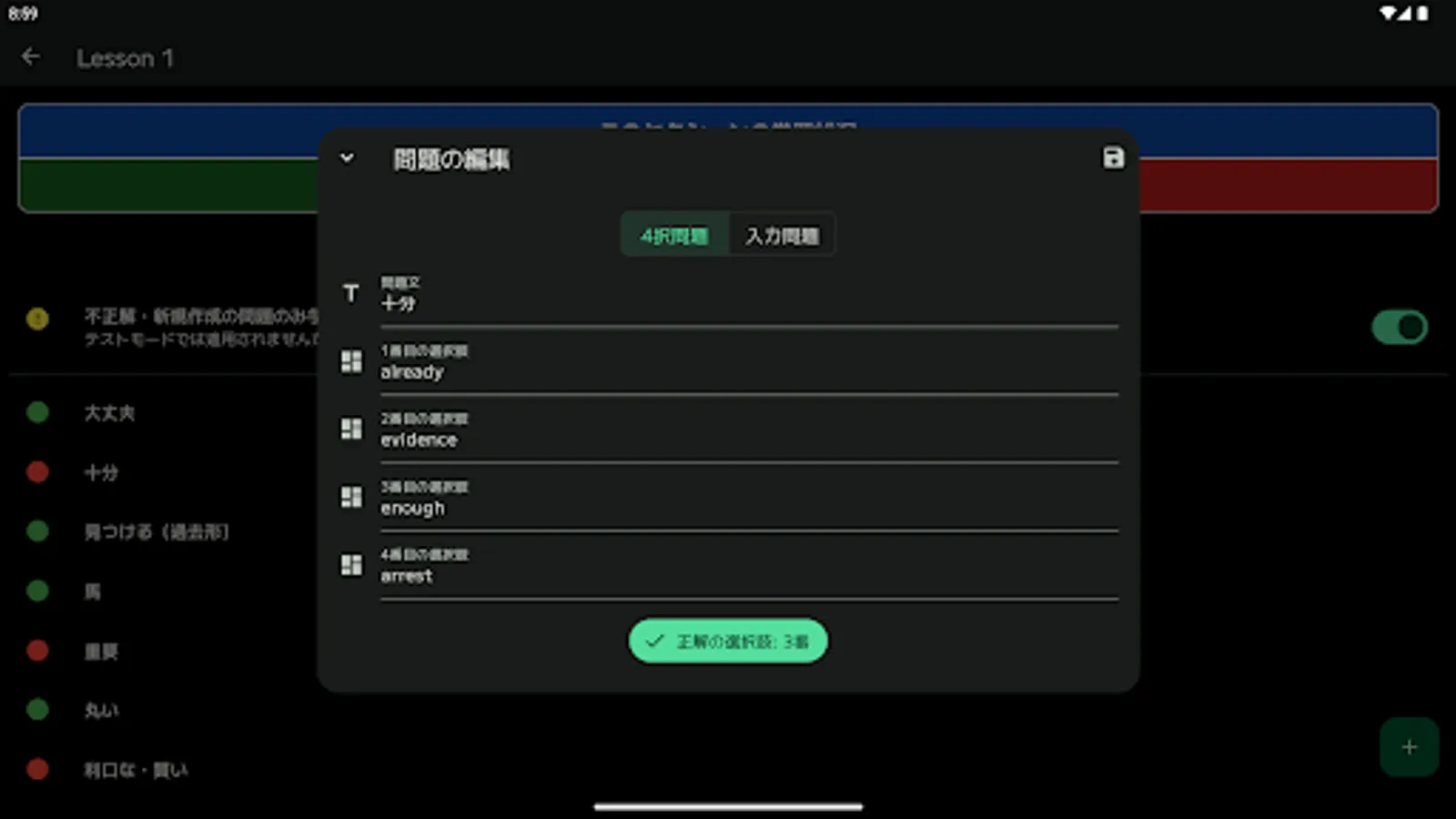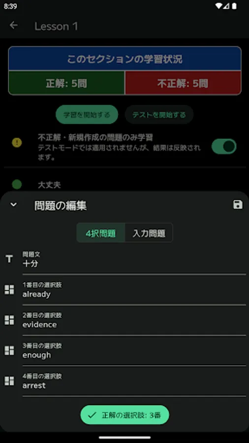 The question format is a 4-choice question or an input question, and there is also a learning mode where you can review the questions that were incorrect, and a test mode where questions are asked at random!