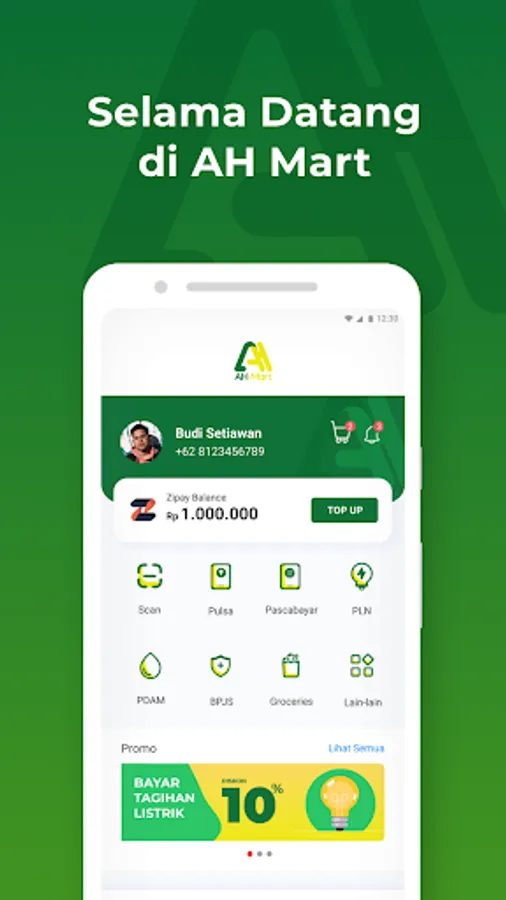 AH Mart is an application for purchasing or paying credit bills, electricity tokens, data packages, BPJS, PDAM, multi-finance, insurance, game vouchers, streaming vouchers, and other bills.