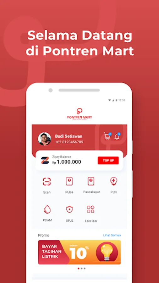 PontrenMart is an application for purchasing or paying credit bills, electricity tokens, data packages, BPJS, PDAMs, multi-finance, insurance, game vouchers, streaming vouchers, and other bills.