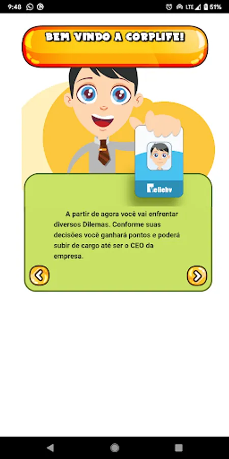 CorpLife é um jogo de coaching que vai ajudar você a enfrentar dilemas e situações difíceis em um ambiente corporativo, de uma forma bem divertida. Se você quer crescer na vida profissional e ter a chance de tomar decisões em situações reais, comece a jogar agora mesmo.