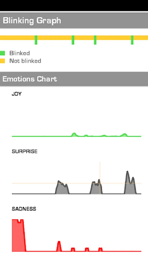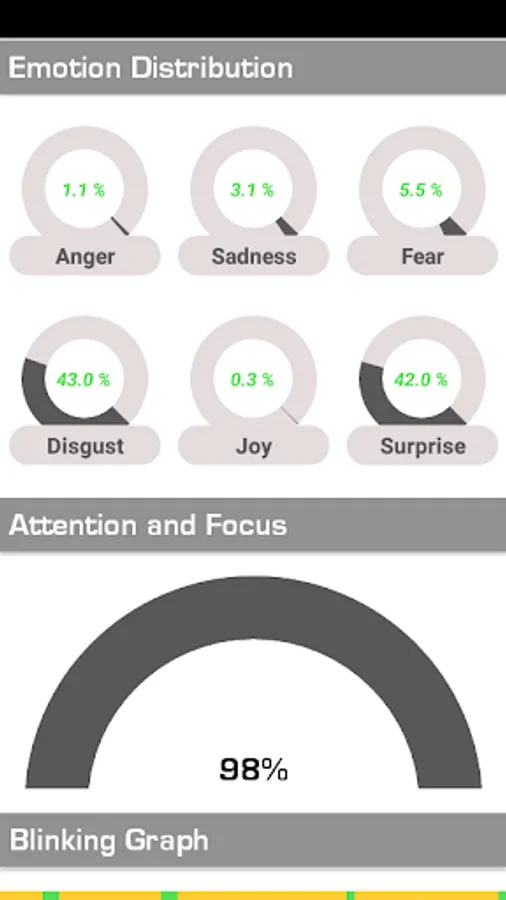 The Interpretation module allows the "Evaluator" to score the "Potential Bullied" interview and gives valuable information related to 6 possible Emotions (Joy, Surprise, Sadness, Anger, Disgust & Fear) generated for each question response, plus "Blink and Attention" graphs to analyze the "Potential Victim" for a conclusion.