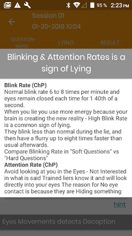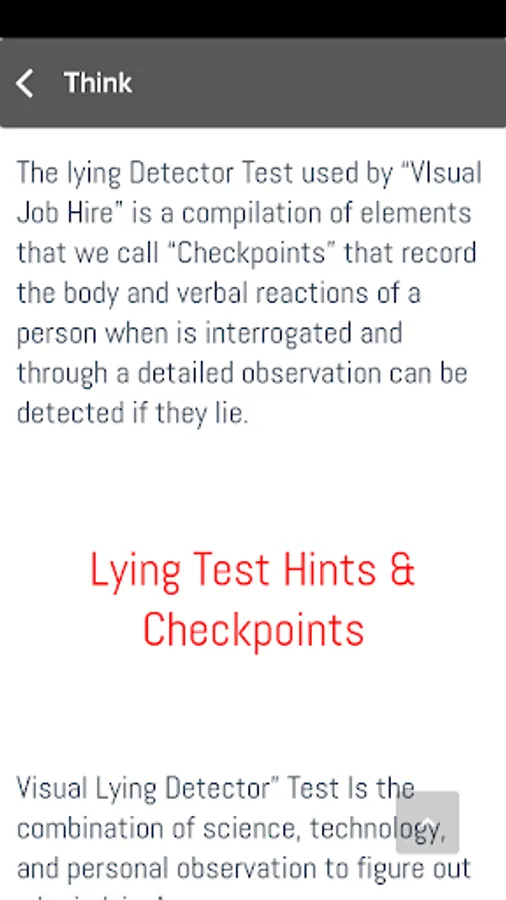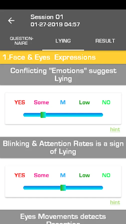 Great value added, is to Evaluate and score if a person is Lying by reviewing detail Checkpoints related to Face & Eye expressions, Verbal responses, body language by applying professional interrogation techniques.