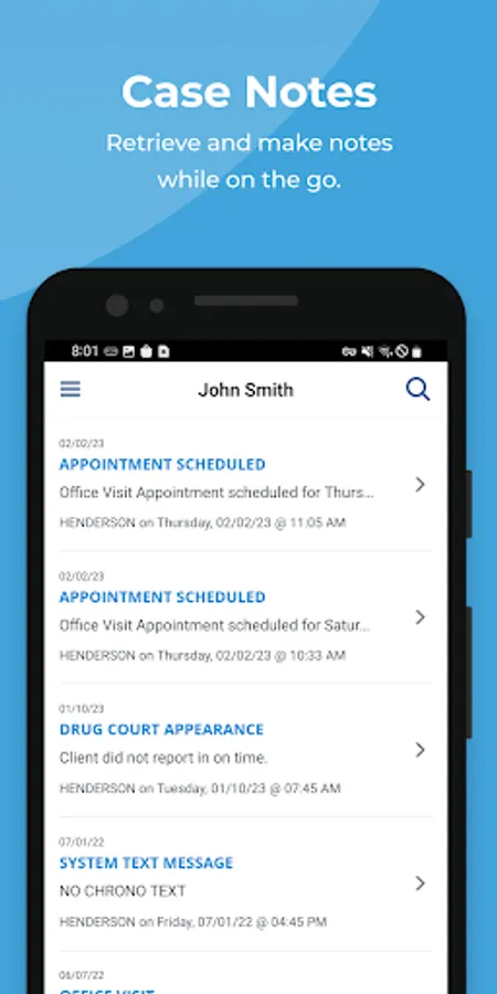 CSS Mobile is the premier case management system for probation and pretrial officers. CSS Mobile provides an officer easy access to client information while in the field. Easy-to-use navigation allows the officer to quickly schedule appointments, add chronos, and update client details without having to return to the office.