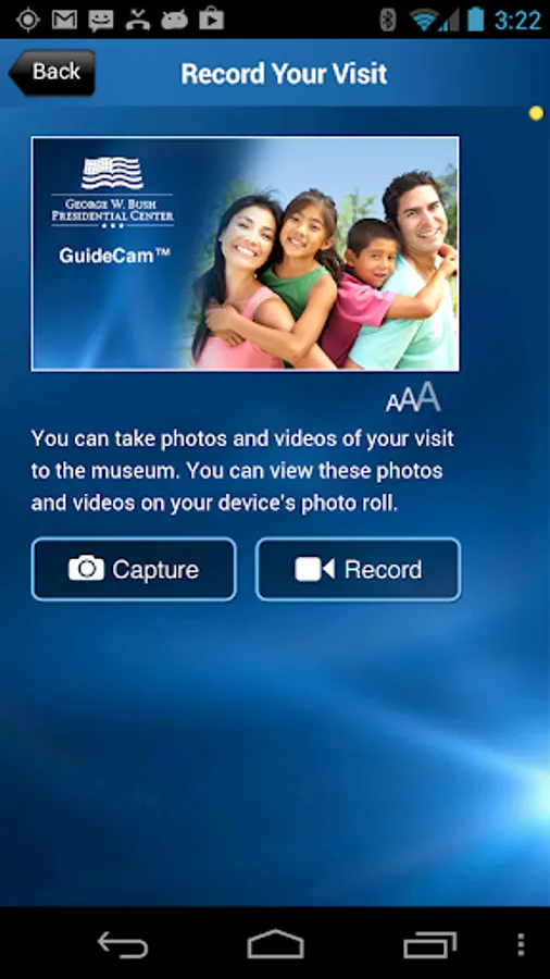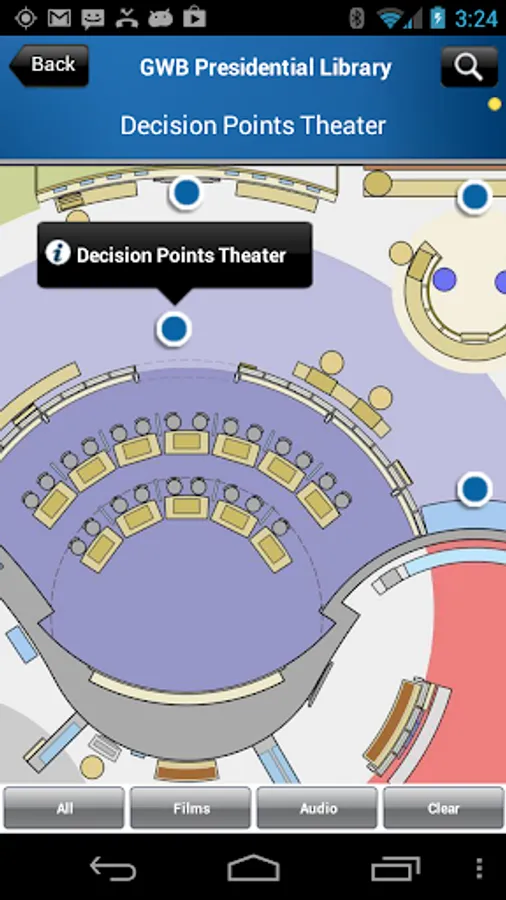 When outside the Bush Center, the app provides information about the George W. Bush Presidential Center, the archives, and a calendar of events, and describes the tour and film content available at the Bush Center.