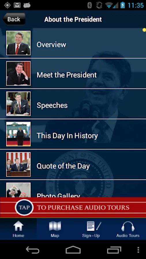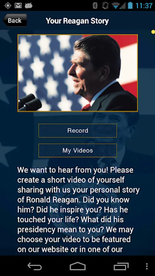 When outside the Reagan Library, the App provides multimedia-rich information about the Presidency, including speeches, audio quotes and video from President Reagan. It also provides planning information for upcoming visits to the Reagan Library.