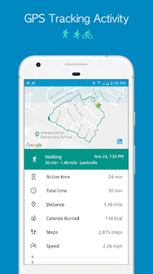 • Activity (walking, running, and biking) tracking with GPS on a map.