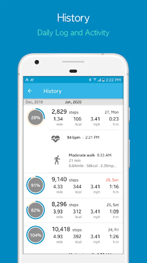 • Daily log history: Tracks steps, distance traveled, calories burned, and walking time.