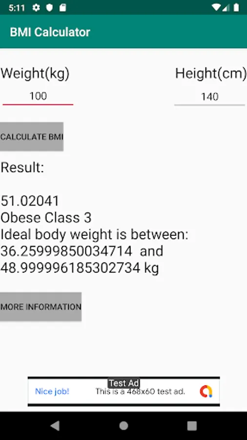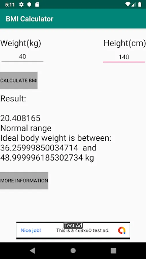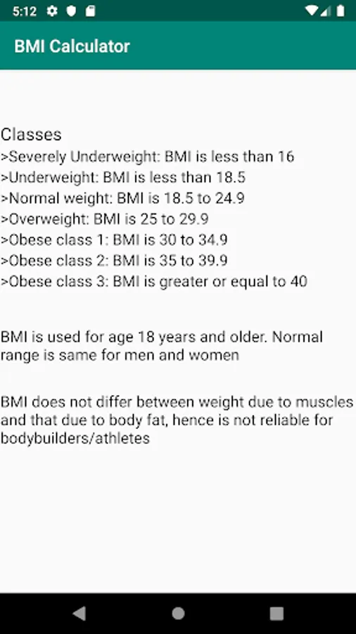This application calculates the Body Mass Index (BMI) which is used to give an idea whether an individual is within the normal weight range for his/her height. Users get the minimum and maximum weight recommended for height. The app also gives the different classes for each BMI value.Information given by the app is for educational purposes only and should not form the sole basis of treatment or diagnosis.