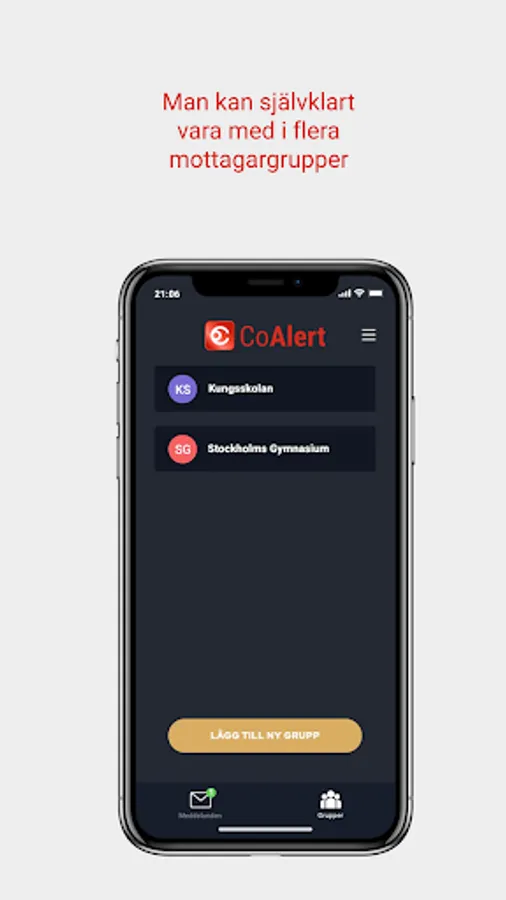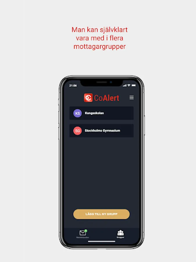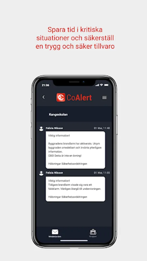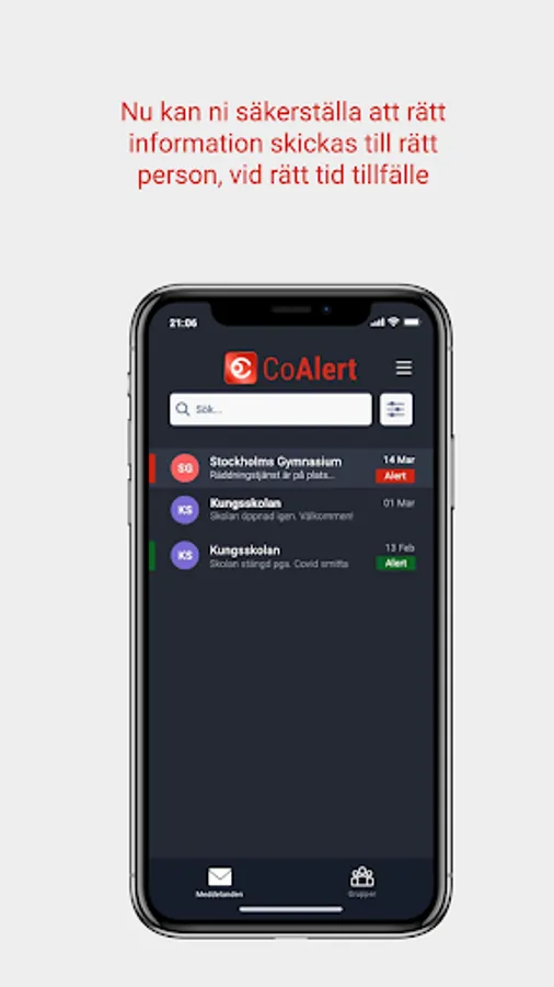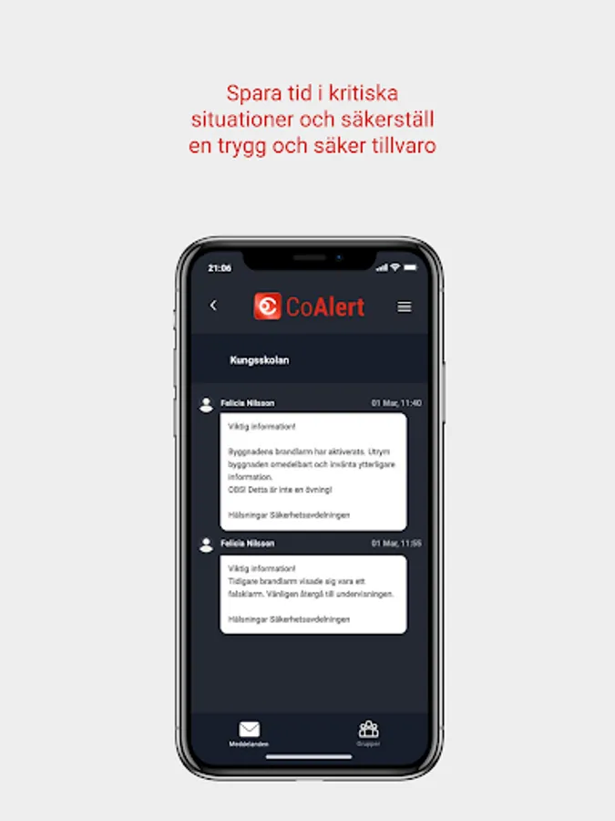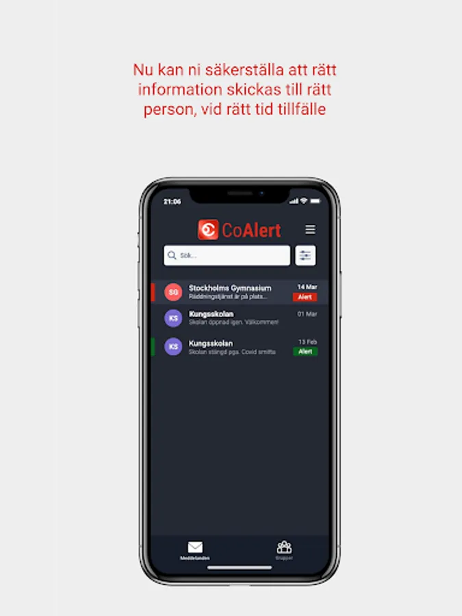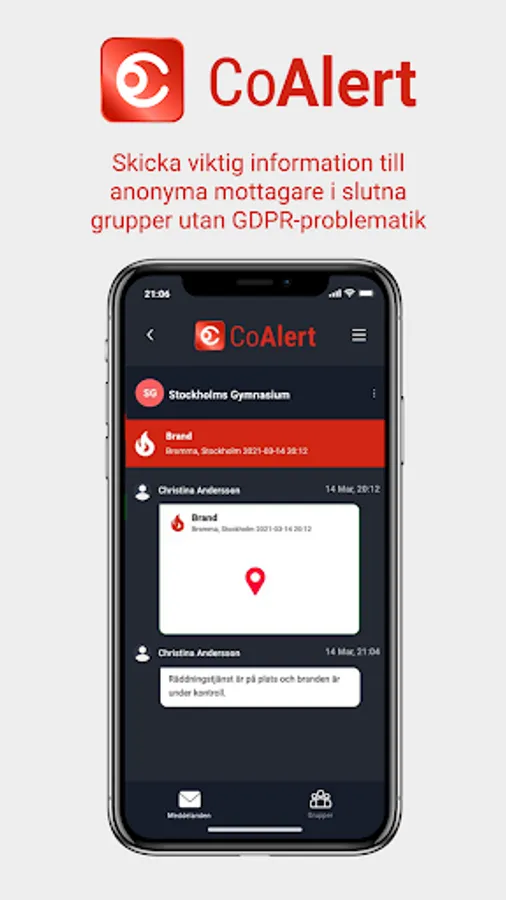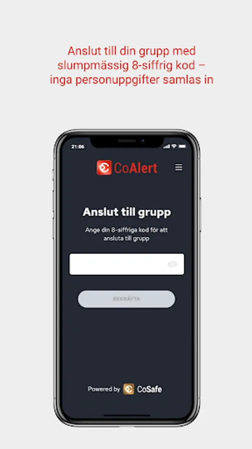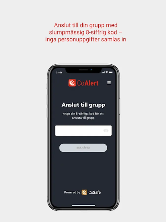 Authorized users of CoSafe can send one-way information to selected anonymous recipient groups in CoAlert. No personal data is required for access to CoAlert, only a random 8-digit code provided by the sender. You can of course be connected to several recipient groups in CoAlert at the same time!