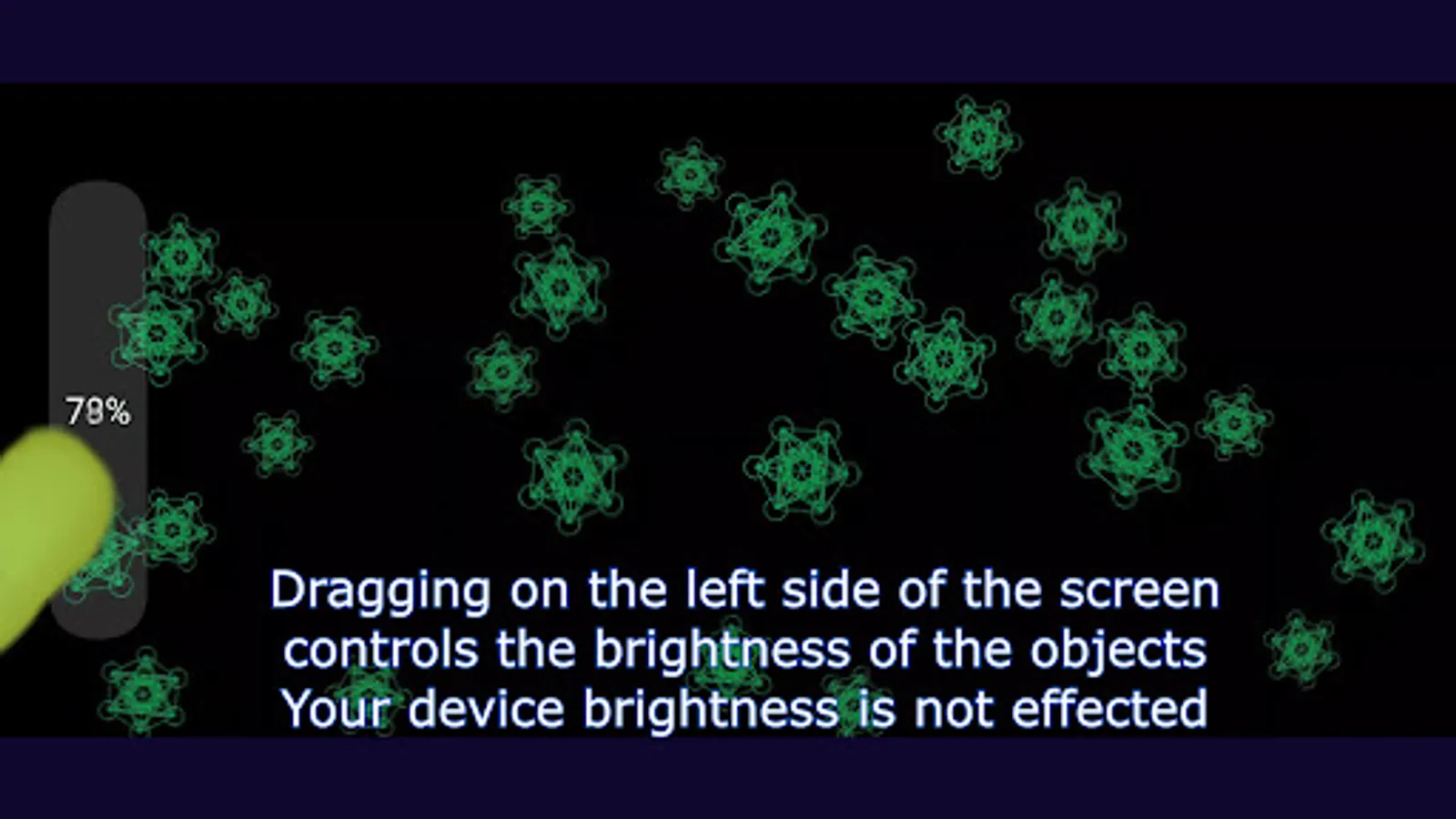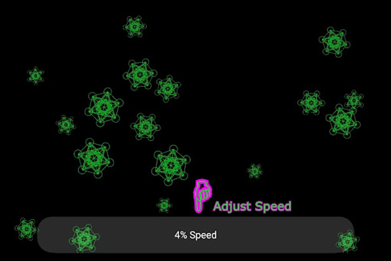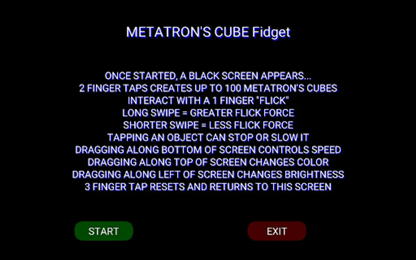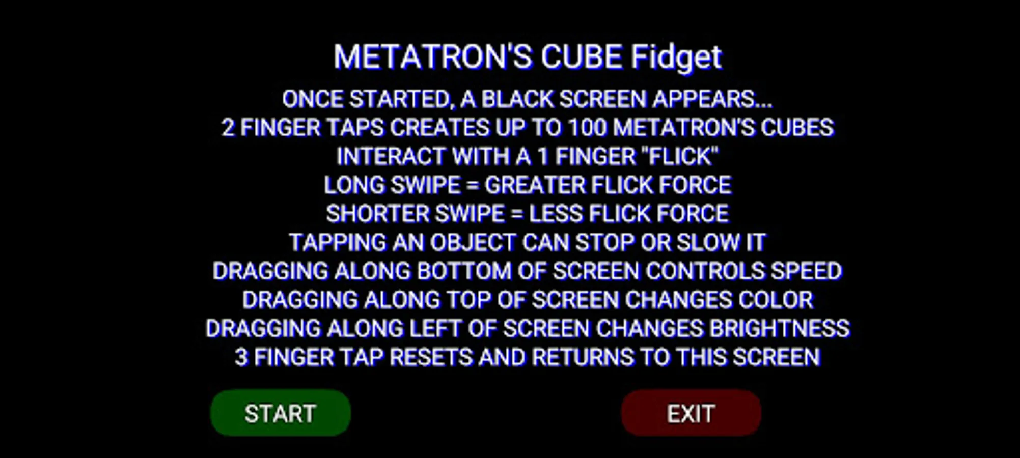 This is a fidget app. Created in southern Humboldt county California. There is no score to attain, and zero challenge to it. This app is about fidgeting around with the physics of Metatron's Cubes in motion. Tapping “Start” brings you to a black screen. Continuous tapping on screen with 2 fingers sends up to 100 Metatron's Cubes of varying size into motion. Upon collision they begin to spin. The force of the collisions with each other or boundaries determines the direction and speed the Metatron's Cubes move and spin. Sliding a finger along the top of the screen changes the color of the Metatron's Cubes. Sliding a finger along the left side of the screen changes the brightness. Changing the speed by sliding a finger along the bottom of the screen, produces a myriad of effects. A 1 finger flick/swipe of an object adds to the chaos. A short flick/swipe has less power than a long flick/swipe. Tap an object to stop it. A flicked or tapped object transfer its energy on collision; whether it is at rest or in motion. These Metatron's Cube objects follow Newton's third law of motion. "Objects in motion, tend to stay in motion and objects at rest, tend to stay at rest; unless acted upon by another force". Tapping with 3 fingers resets everything and returns to the start screen. I welcome all comments and suggestions (apps@cosmicgoo.com).