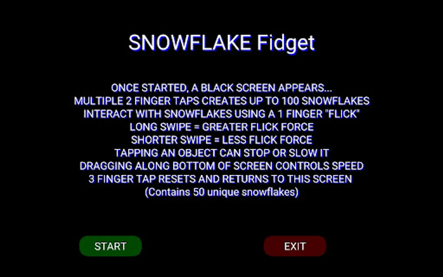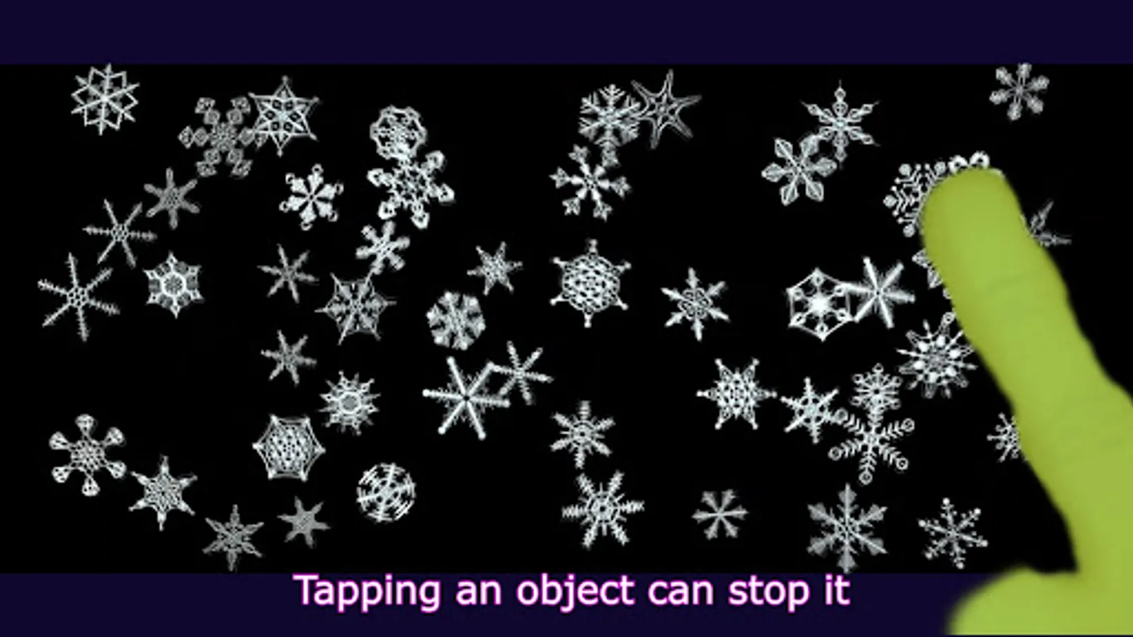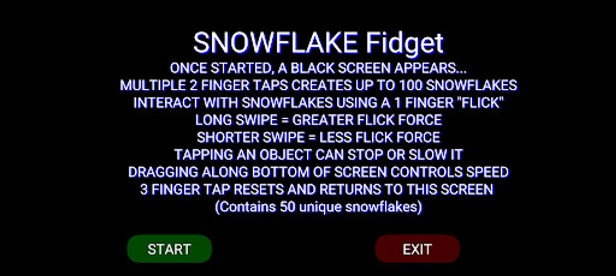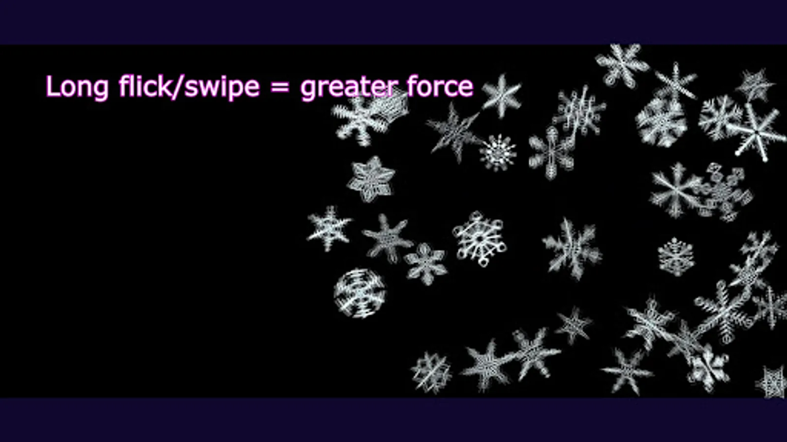 Tapping “Start” brings you to a black screen. Continuous tapping on the screen with 2 finger sends up to 100 Snowflakes of varying size into motion. Upon collision they begin to spin. The force of the collisions with each other or boundaries determines the direction and speed the Snowflakes move and spin. Changing the speed by sliding a finger along the bottom of the screen, produces a myriad of effects. These Snowflake objects follow Newton's third law of motion. "Objects in motion tend to stay in motion and objects at rest tend to stay at rest; unless acted upon by another force". Directly interact with the Snowflakes with 1 finger flick/swipe. A short flick/swipe = less energy. A longer flick/swipe = greater energy. As the flicked object collides with other objects, it's energy is transferred. Each object passes the energy received to next and so on... Tapping an object in motion can stop it . Tapping with 3 fingers resets everything and returns to the start screen.