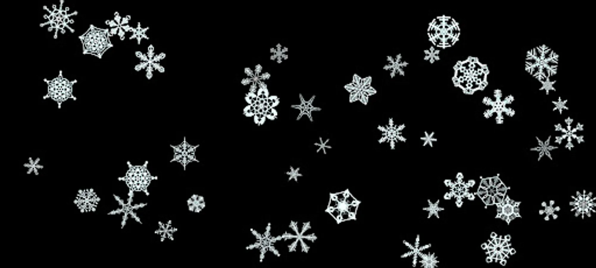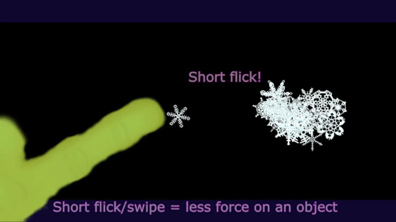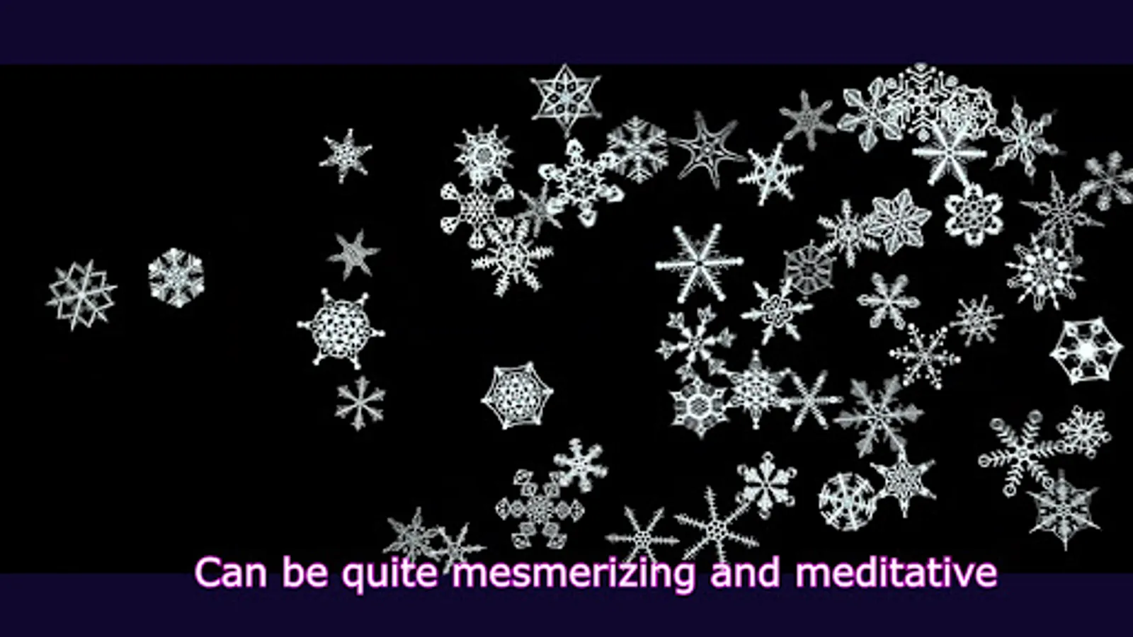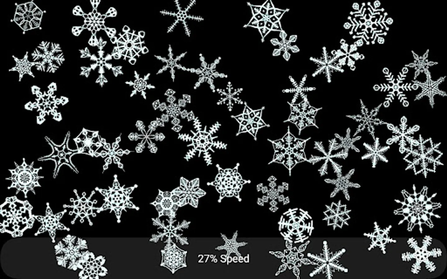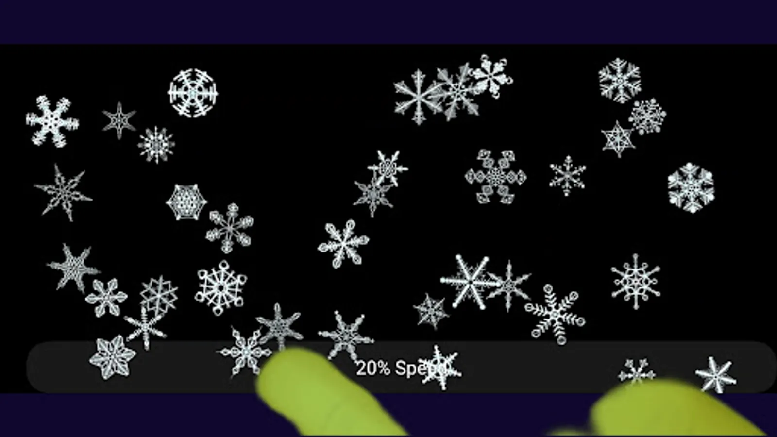 Tapping “Start” brings you to a black screen. Continuous tapping on the screen with 2 finger sends up to 100 Snowflakes of varying size into motion. Upon collision they begin to spin. The force of the collisions with each other or boundaries determines the direction and speed the Snowflakes move and spin. Changing the speed by sliding a finger along the bottom of the screen, produces a myriad of effects. These Snowflake objects follow Newton's third law of motion. "Objects in motion tend to stay in motion and objects at rest tend to stay at rest; unless acted upon by another force". Directly interact with the Snowflakes with 1 finger flick/swipe. A short flick/swipe = less energy. A longer flick/swipe = greater energy. As the flicked object collides with other objects, it's energy is transferred. Each object passes the energy received to next and so on... Tapping an object in motion can stop it . Tapping with 3 fingers resets everything and returns to the start screen.