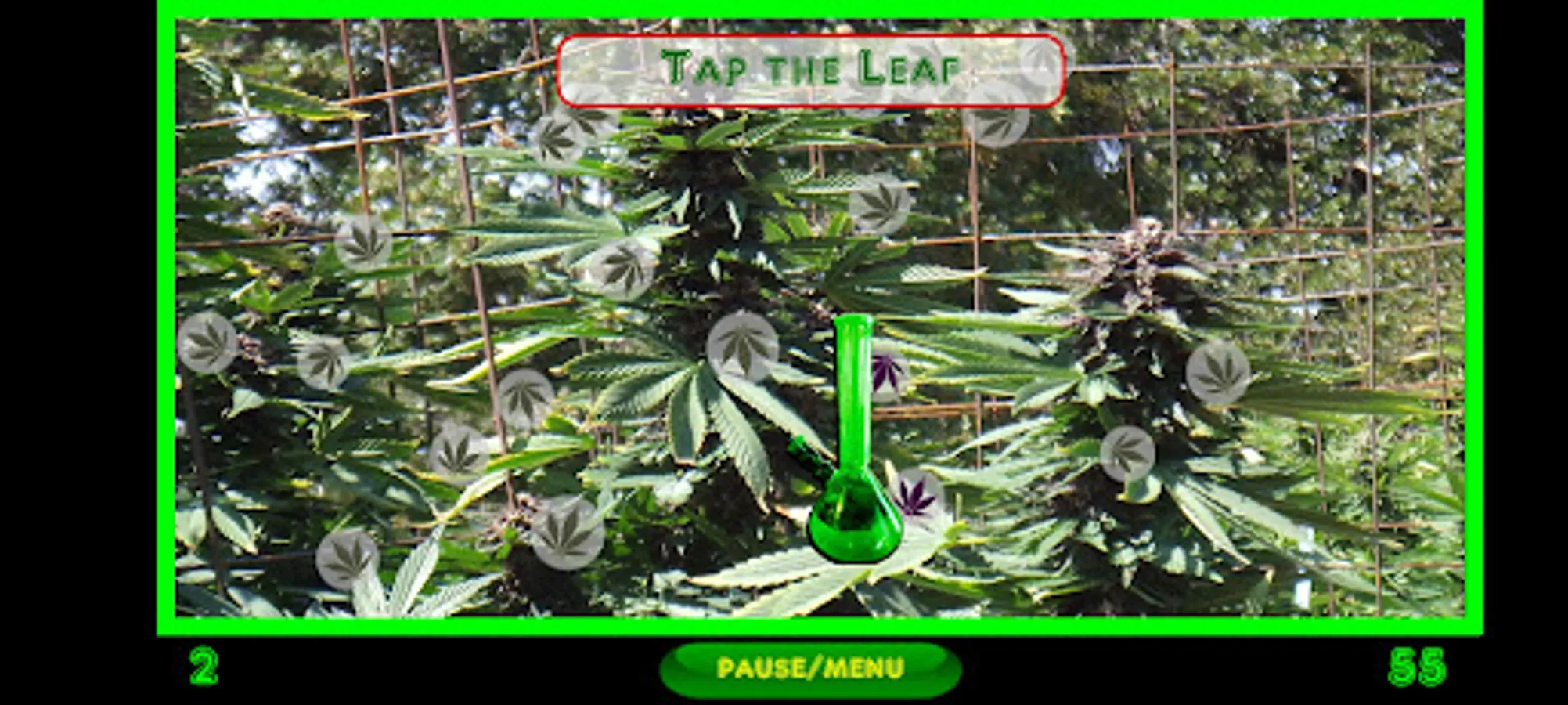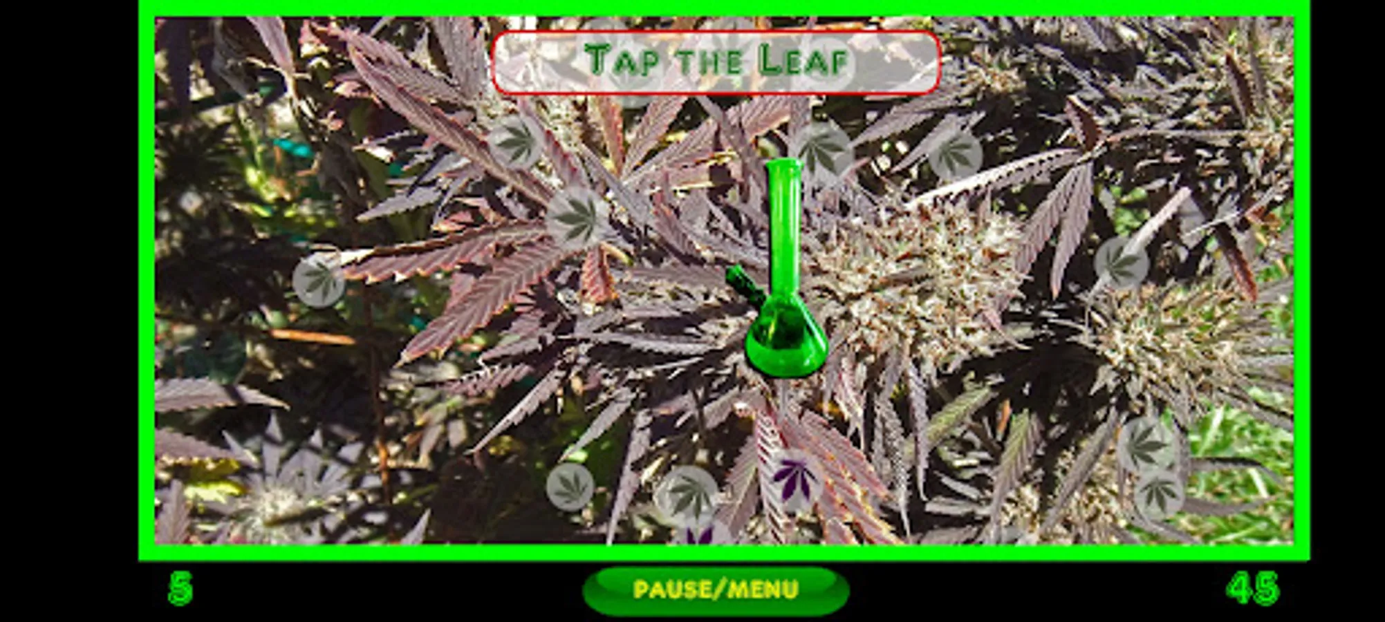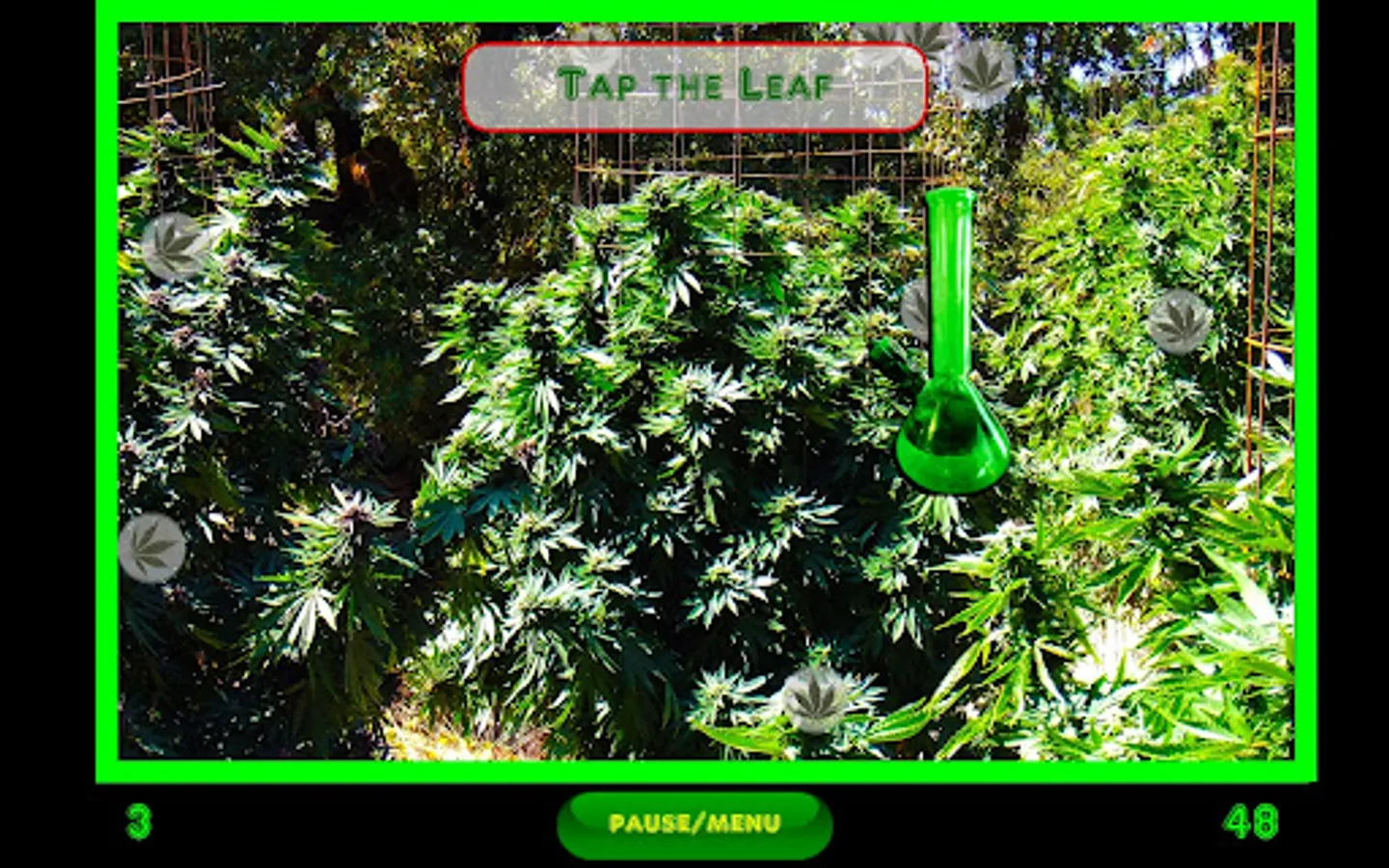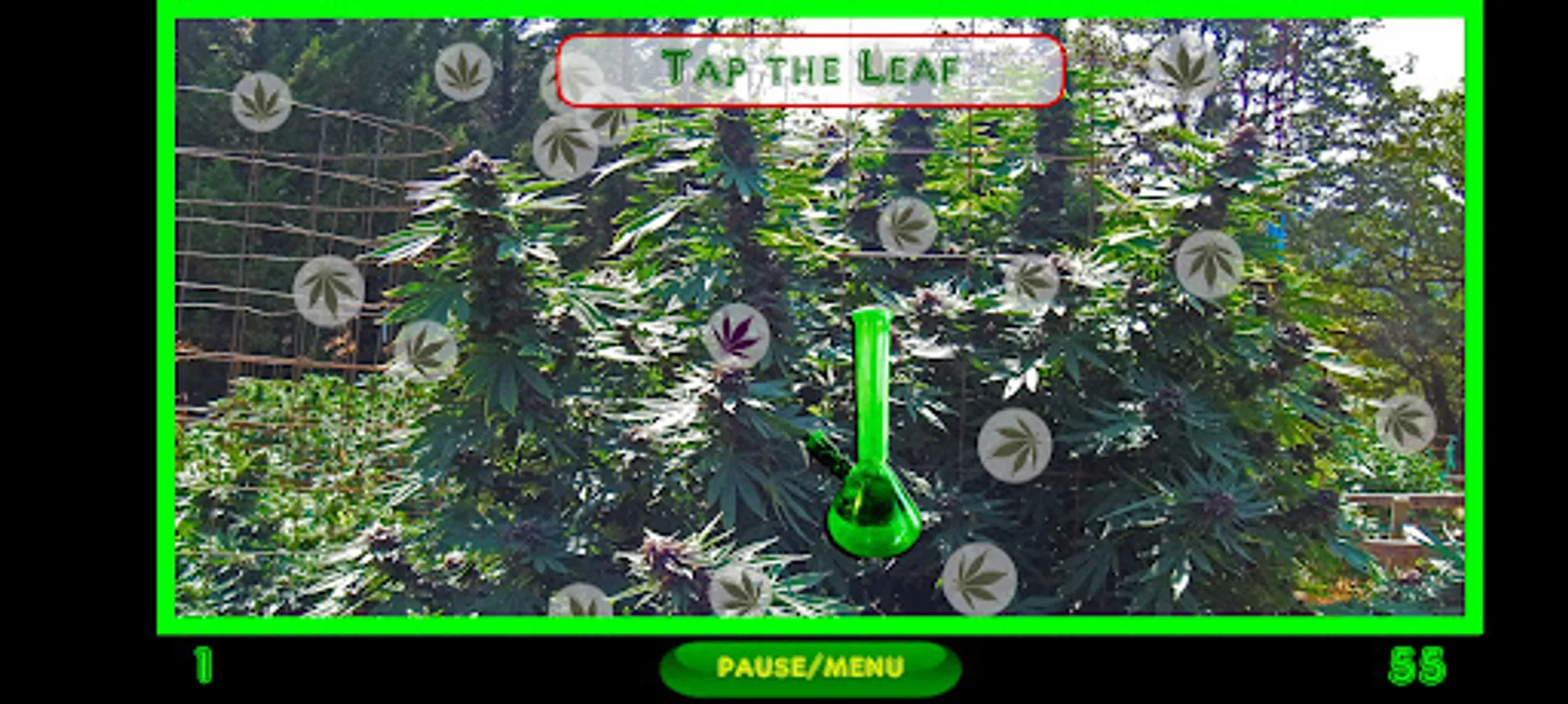 The object of this game is, with your finger on the base of the bong, control the bong to tap as many leaves as you can, with the bowl of the bong, within the allotted time. Tap a leaf, it turns purple and a point is awarded. Tap the same leaf, it turns back to green and a point is lost. The timer can be set to 60(default) or 120 seconds. The top ten scores in each time category are saved. When paused, changing any menu setting restarts the game. You can clear the top ten scores by going into Apps in you device's settings; selecting “Tap the Leaf” and choosing Clear Data.