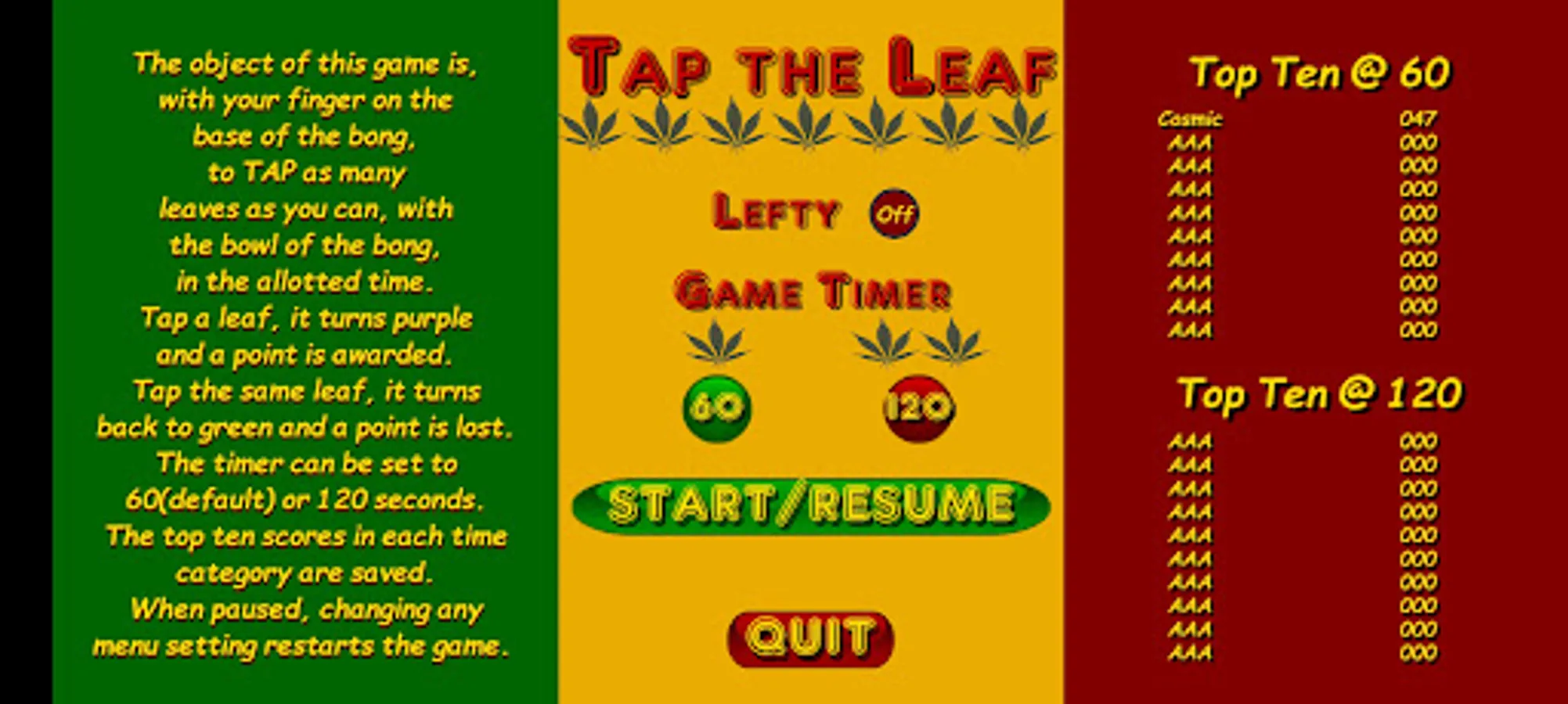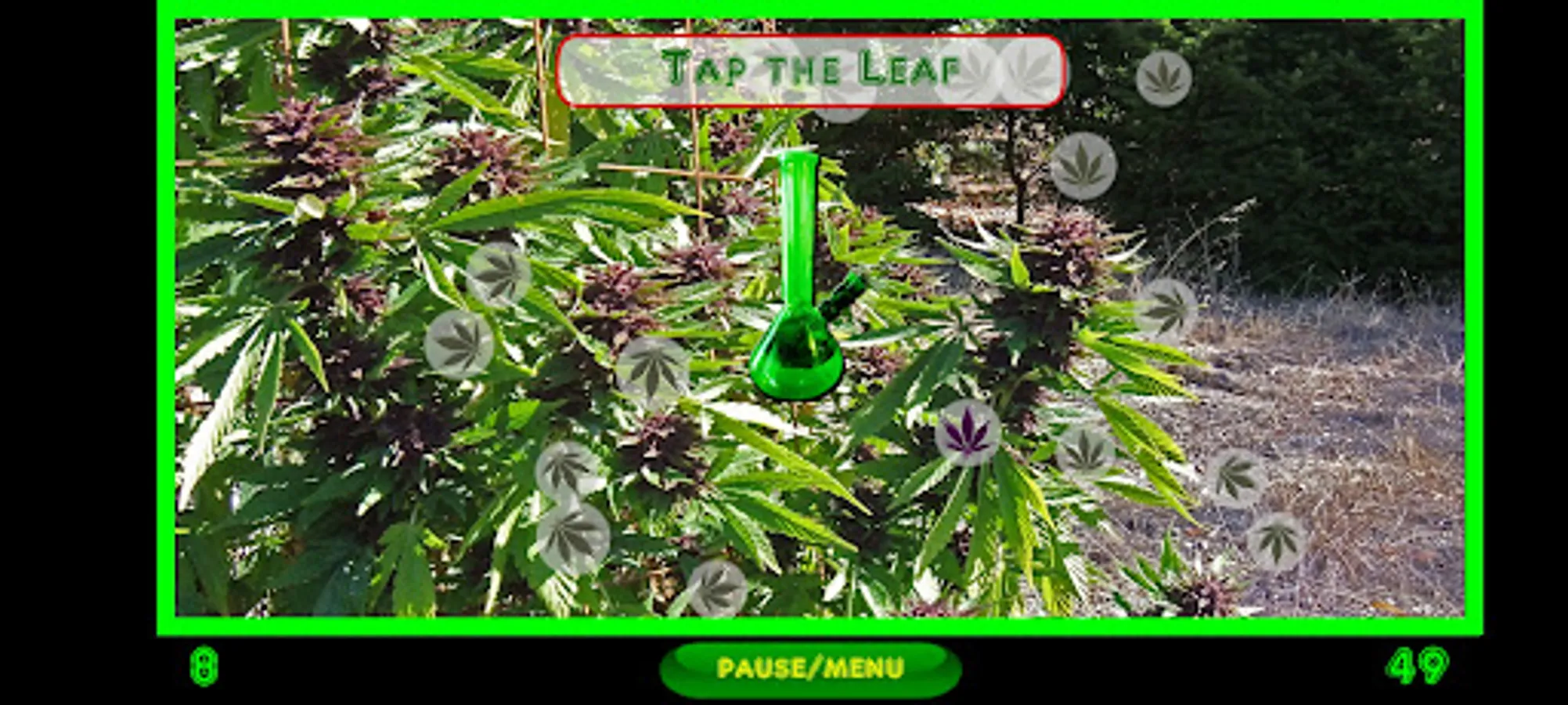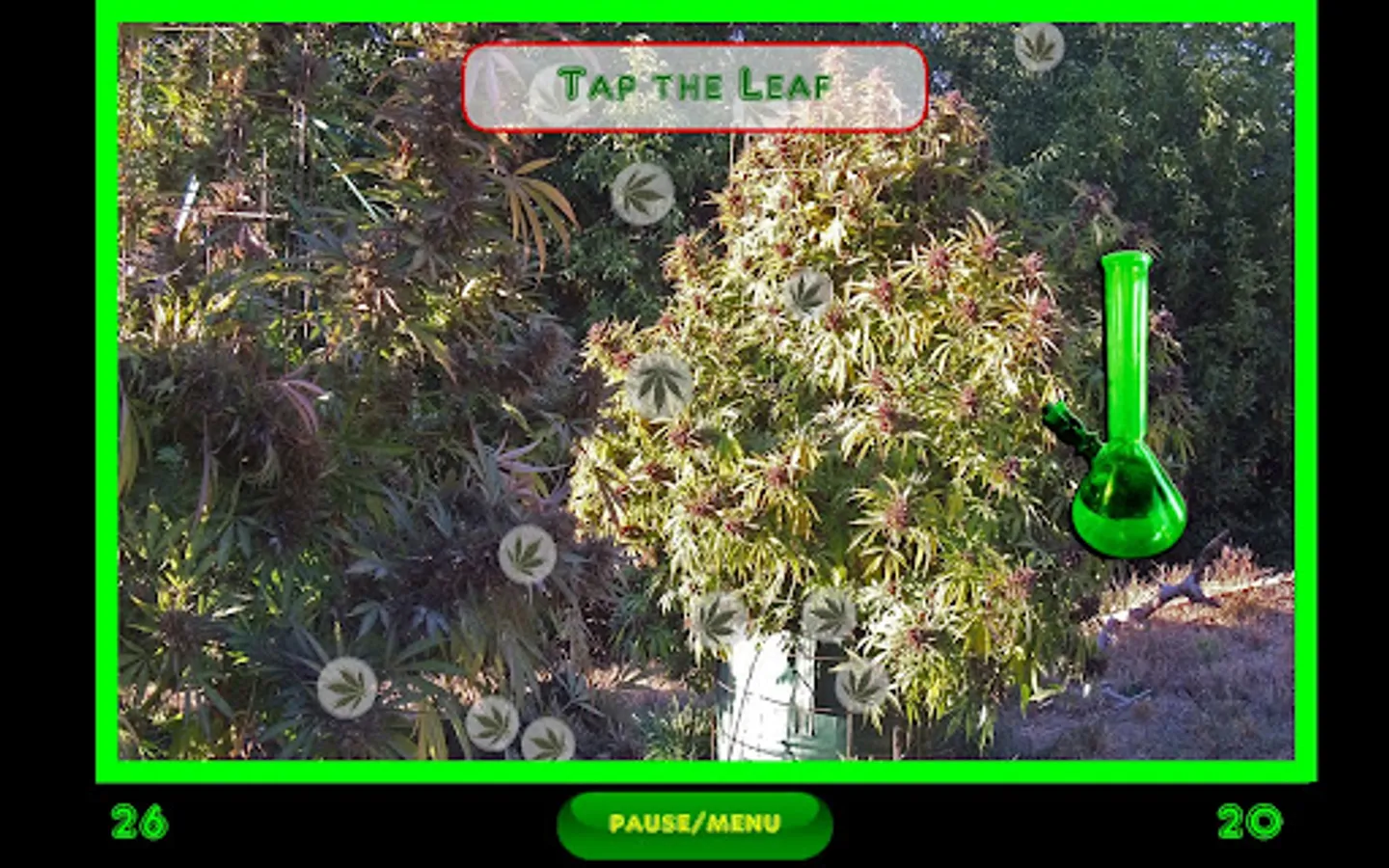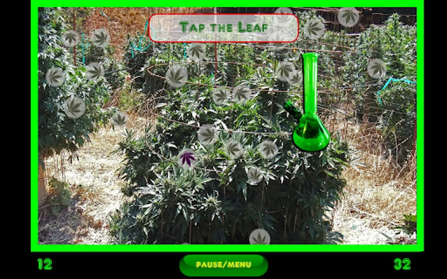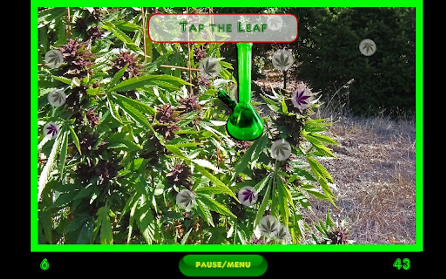 The object of this game is, with your finger on the base of the bong, control the bong to tap as many leaves as you can, with the bowl of the bong, within the allotted time. Tap a leaf, it turns purple and a point is awarded. Tap the same leaf, it turns back to green and a point is lost. The timer can be set to 60(default) or 120 seconds. The top ten scores in each time category are saved. When paused, changing any menu setting restarts the game. You can clear the top ten scores by going into Apps in you device's settings; selecting “Tap the Leaf” and choosing Clear Data.