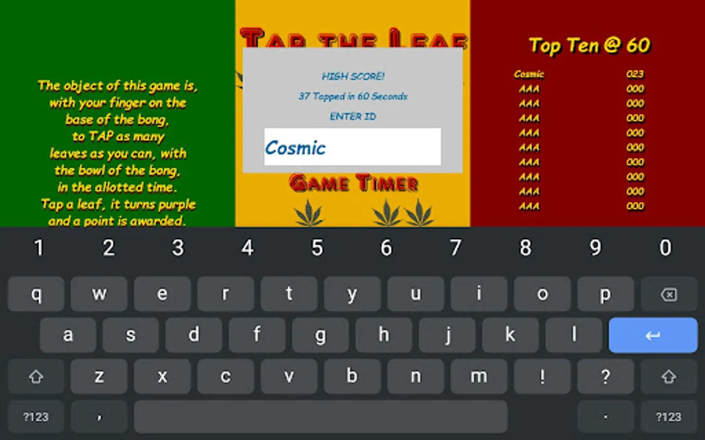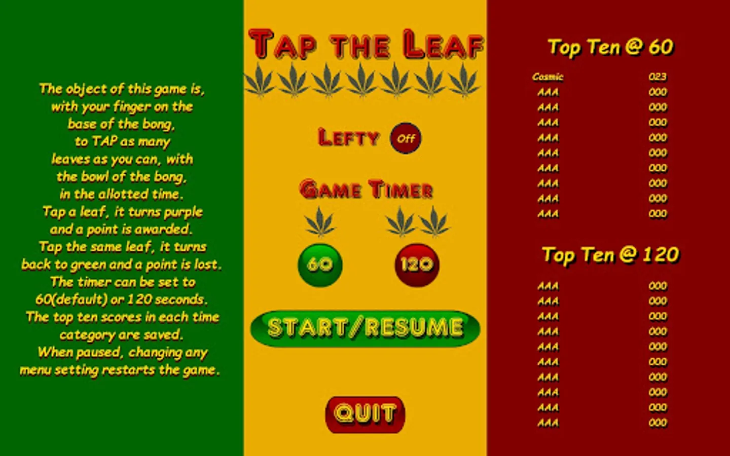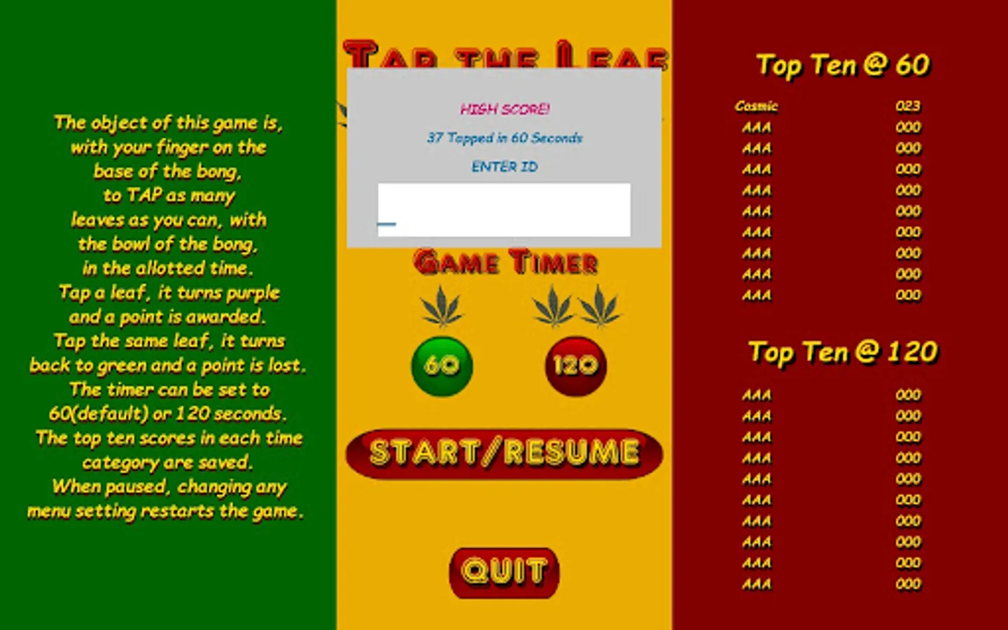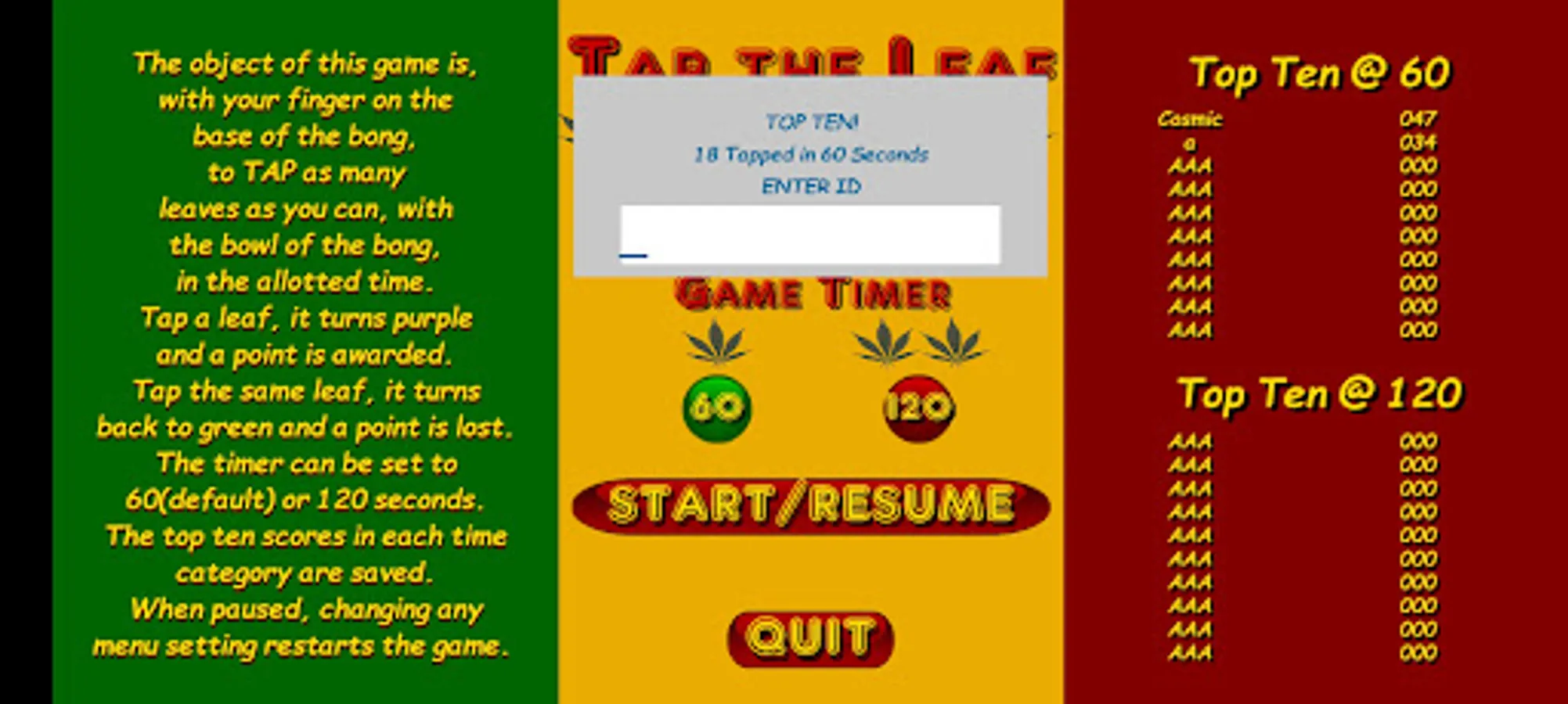 The object of this game is, with your finger on the base of the bong, control the bong to tap as many leaves as you can, with the bowl of the bong, within the allotted time. Tap a leaf, it turns purple and a point is awarded. Tap the same leaf, it turns back to green and a point is lost. The timer can be set to 60(default) or 120 seconds. The top ten scores in each time category are saved. When paused, changing any menu setting restarts the game. You can clear the top ten scores by going into Apps in you device's settings; selecting “Tap the Leaf” and choosing Clear Data.