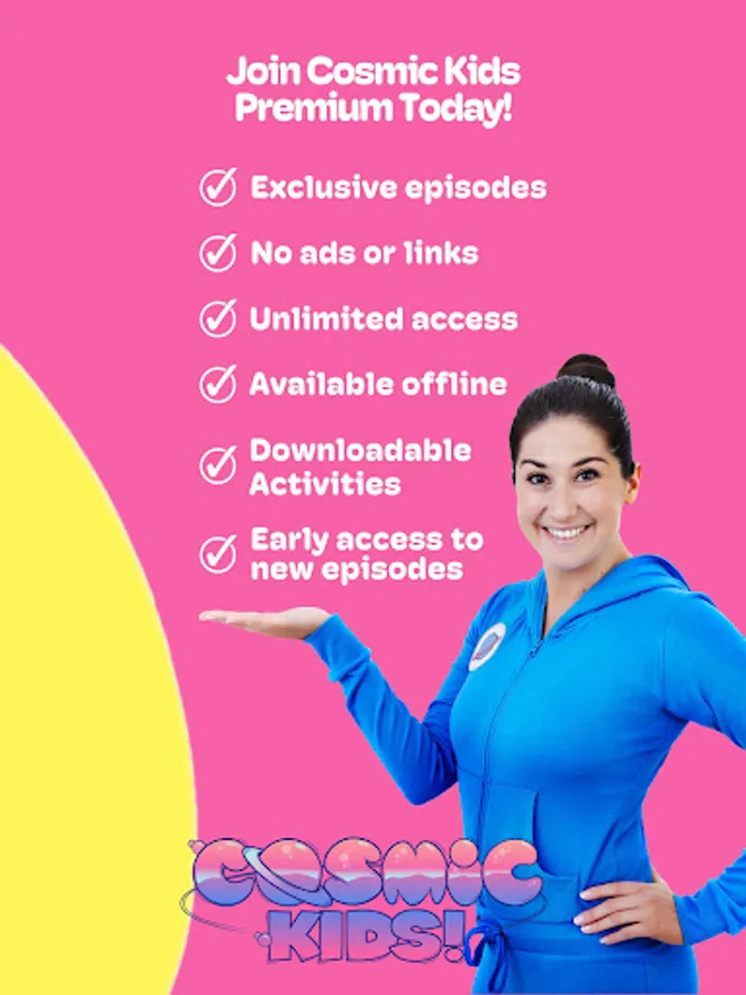 To access all features and content you can subscribe to Cosmic Kids on a monthly or yearly basis with an auto-renewing subscription right inside the app.* Pricing can vary be region and will be confirmed before purchase in the app. In app subscriptions will automatically renew at the end of their cycle.