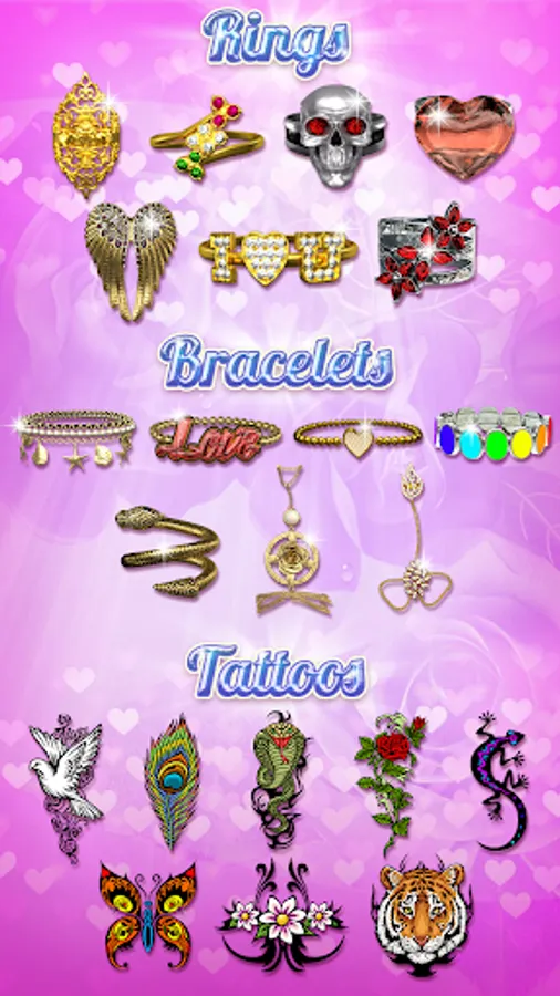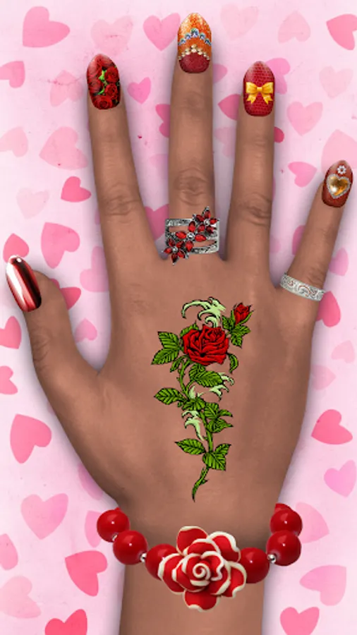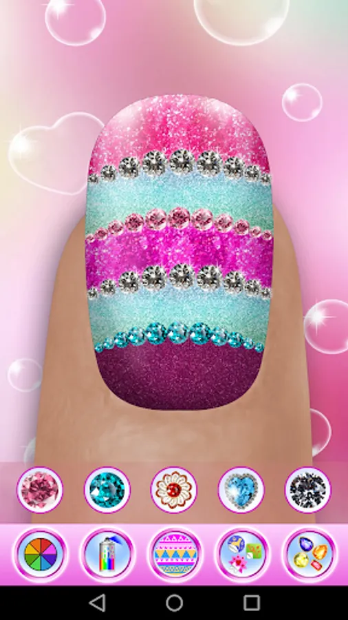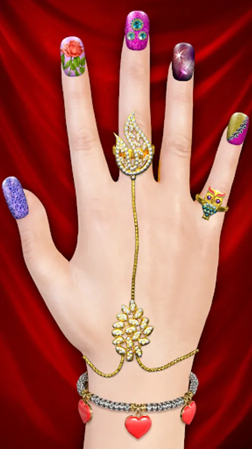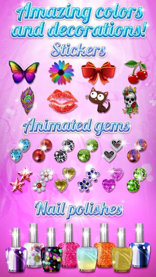 Nail Salon it is a great, free application. Take the chance to design your dream fingers. In Nail Salon you can create your own nail art designs. Show off your skills and style! Inside application you will find many options. Choose from lots of different shapes of nails, stickers and diamonds, nail polishes. Some of the decorations are animated. Complete your stylizations beautiful bracelets and rings. If you are little crazy put on hand amazing tattoos.