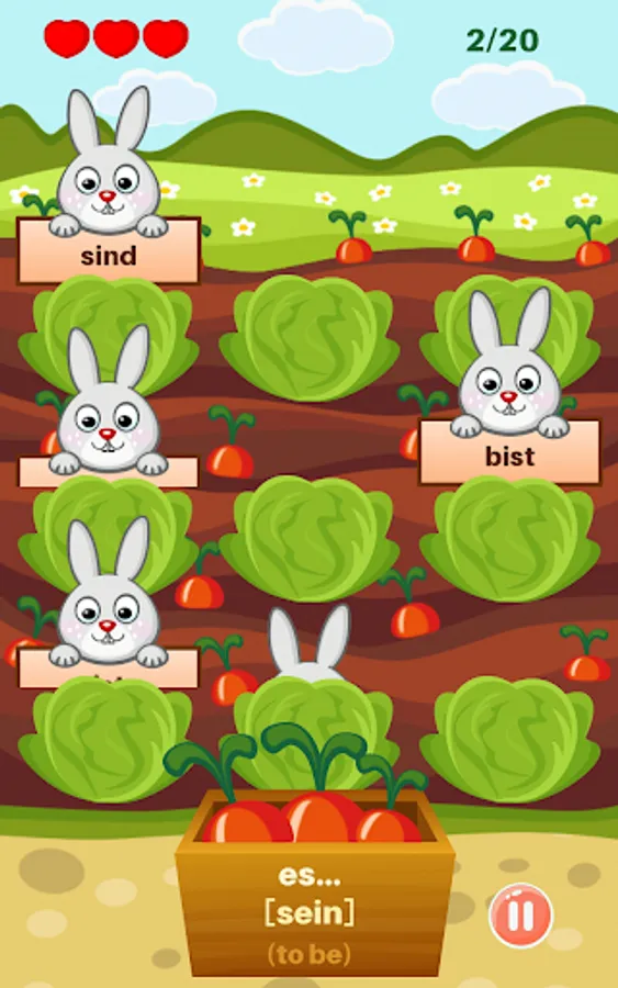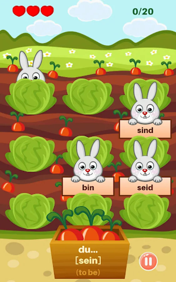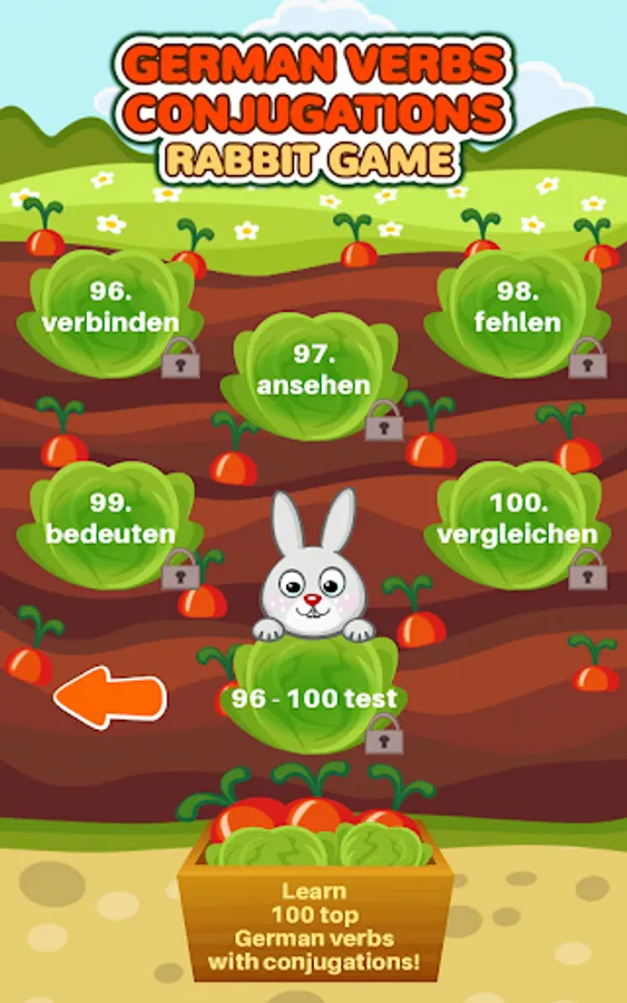 With our German Verbs Rabbit Game, you will learn 100 top used German verbs with their conjugations in Present Tense and improve your knowledge of German grammar in a simple and fun way.