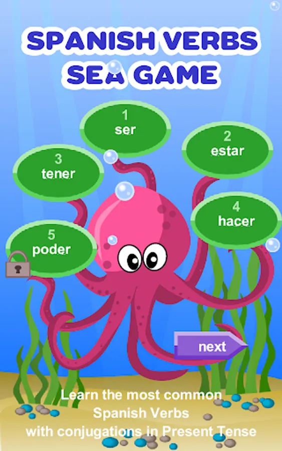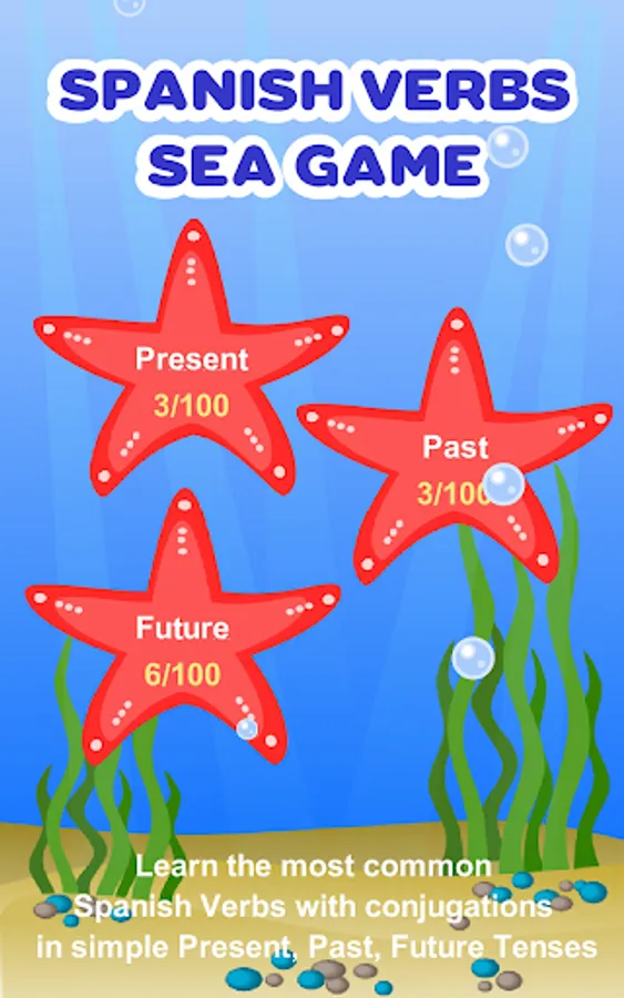 With our Spanish Verbs Sea Game you will learn the most common Spanish verbs with their conjugations in simple Present, Past and Future Tenses.
