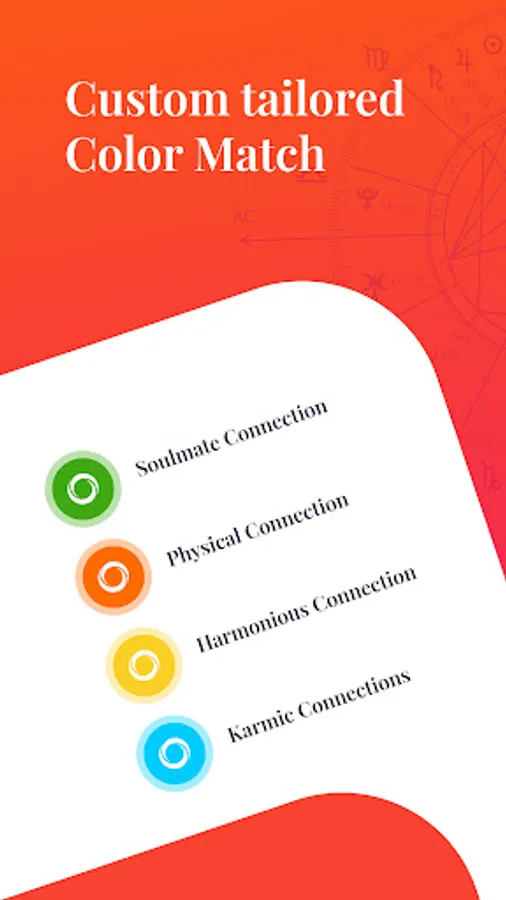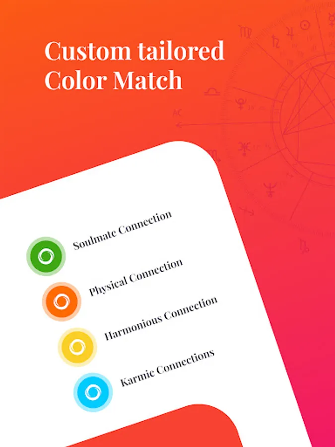 2. Four-color matching system: Easily assess potential matches with our color-coded system - green for soulmate, orange for physical, yellow for harmonious, and blue for karmic connections.