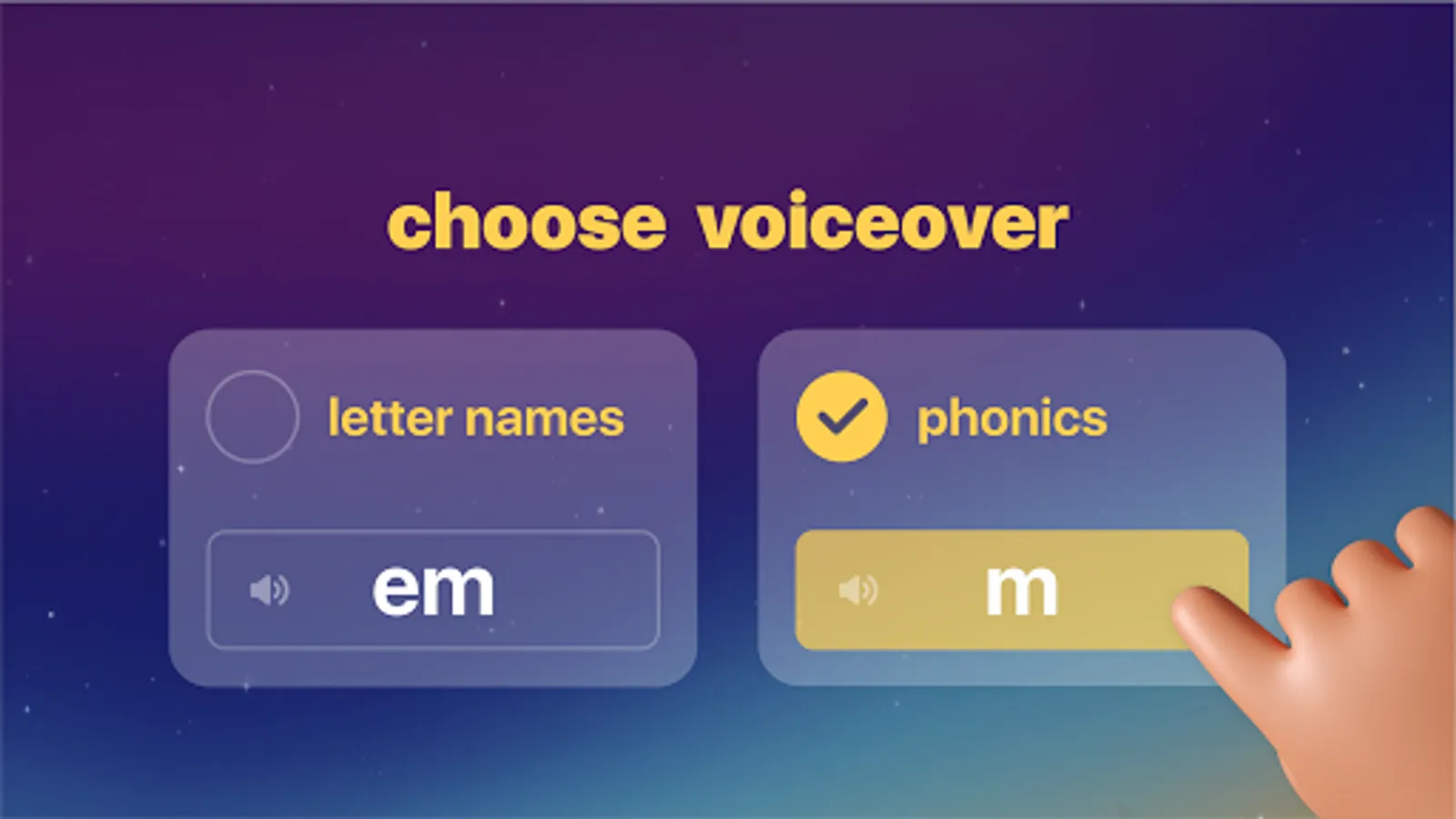 Сosmo Panda app has 2 voiceover options - “Letter Names” and “Phonics”.