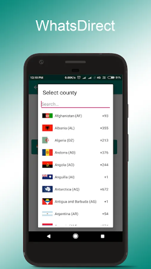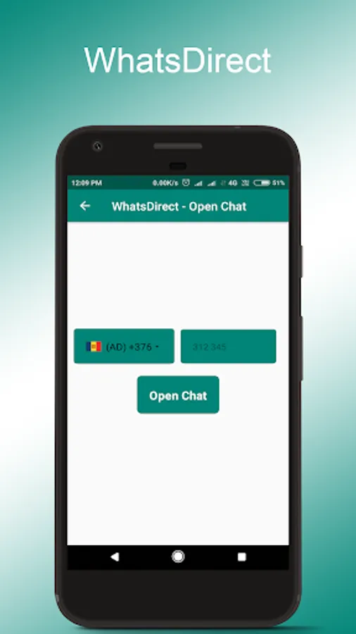 Simply open the WhatsMsg Direct Chat application and enter the number and select nation / Country from the drop down list.