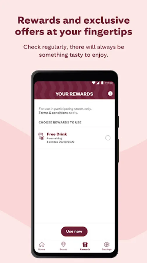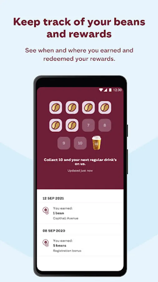 • Track your beans balance to see when you have enough for a free regular handcrafted drink.