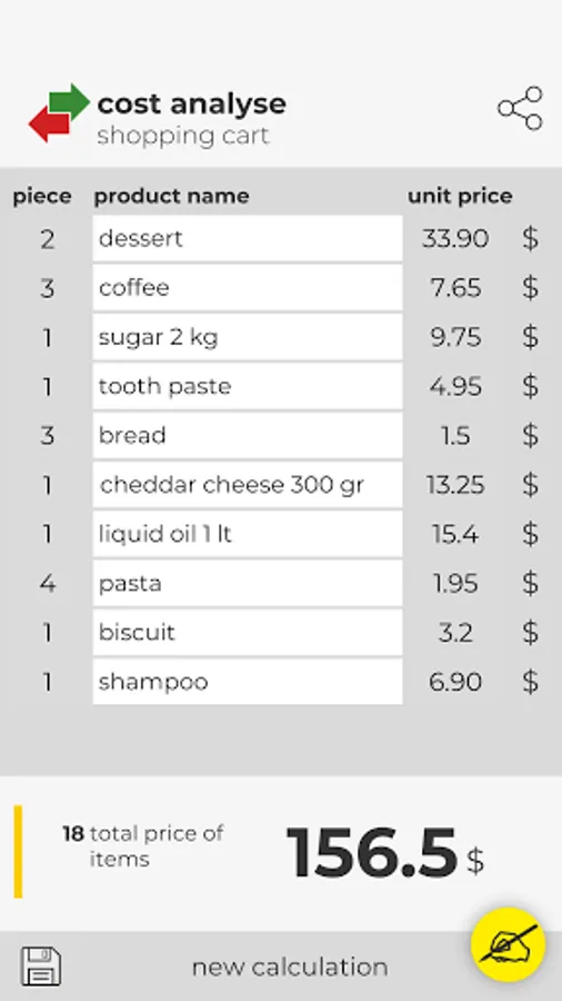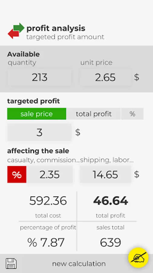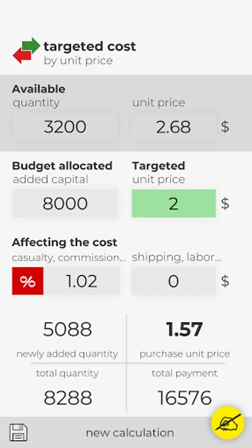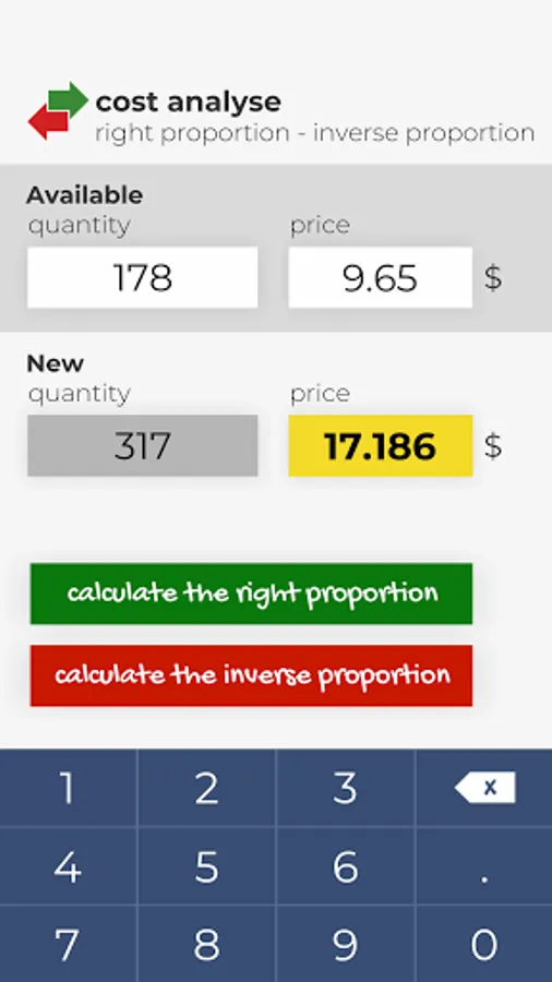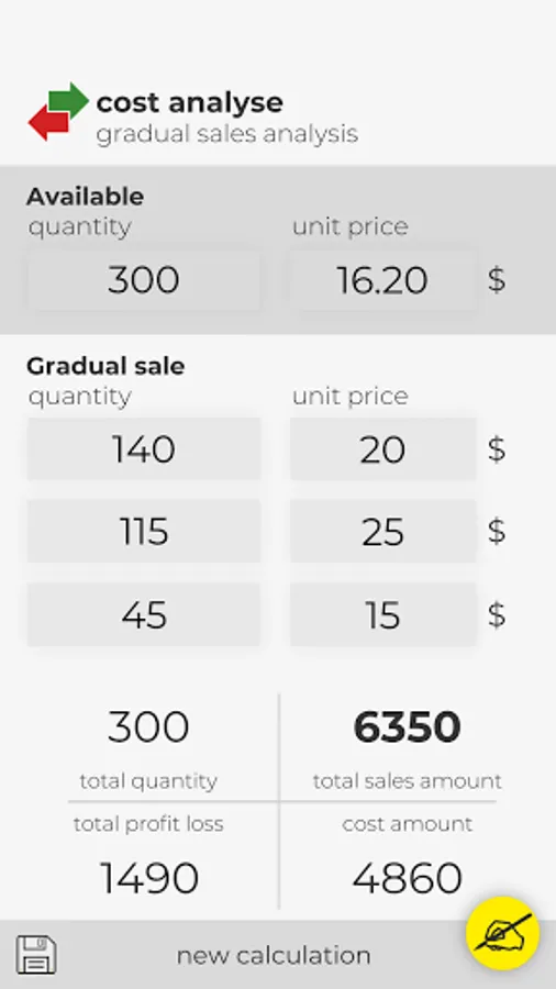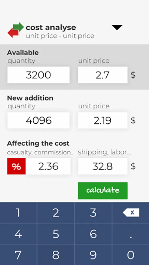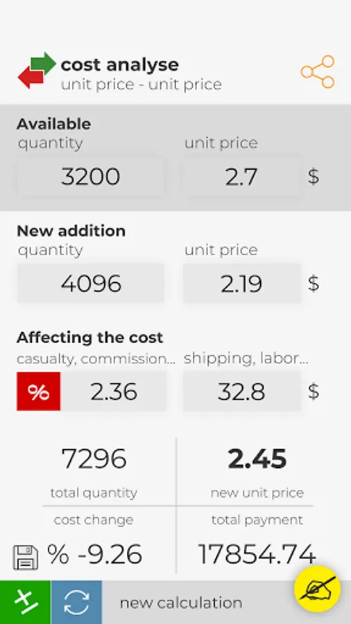 <meta name = "keyword" content = "cost, analysis, analyse, analyze, reduce, change, profit, loss, shopping, cart, basket, gradual, sale, target, crypto, discount, gain, advantage, capital, buy, sell, stock, dollar, euro, gold, finance, money, wallet``><br><br><b> cost change </b><br>It calculates how much you will buy at what price to reduce the cost of your existing product. Calculates the cost of the current product after the second purchase.<br><br><b> cost analysis </b><br>Calculates the directly proportional and inversely proportional result of the second data according to the available data.<br><br><b> targeted cost </b><br>In order to reduce the cost of your existing amount of product, it calculates how much product you need to buy at which unit cost with your budget.<br><br><b> profit - loss analysis </b><br>It calculates how much you will earn when the current product is sold at what unit price. Or it calculates the amount of your loss you will incur when selling all or part of your loss<br><b> progressive sales analysis </b><br>Calculates the sales amount after the sale of the current product from 3 different sales figures.<br><b> shopping cart </b><br>Calculates the sales amount of the products you buy from a market. It allows you to prepare and save your shopping list before you go shopping.