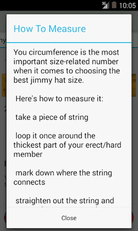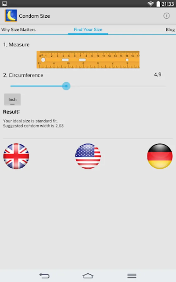 It's pretty simple - this app will help you find the right condom size in just a couple of easy to follow steps. The app will instruct you on how to take your measurement and after you input your vital stats you'll find out what's the best condom size for you. There are several condom size charts that comes with this app (US, UK and GE) from which you can choose the appropriate condom or check out how different brands compare when it comes to size.