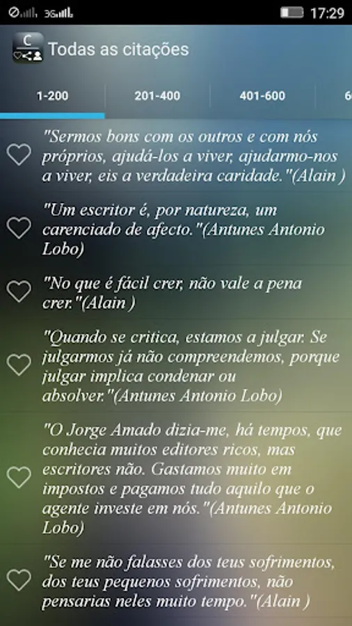 Quotes by Authors: Alain, Antunes António Lobo, Aristotle, Alighieri Dante, Assis Machado Andrade Eugene Allen Woody, Aurelio Marco, Amiel Henri, Andrade Carlos Drummond, Alemán Mateo, Adorno Theodore, Ariosto Ludovico, Alfieri Vittorio, Aretino Pietro, Addison Joseph, Asimov Isaac, Alencar Jose Allende Isabel, Bierce Ambrose, Balzac Honoré de, Bessa-Luís Agustina, Bacon Francis, Napoleon Bonaparte, Brito Casimiro, Benavente y Martinez Jacinto Borges Jorge, Byron George [Lord], Beauvoir Simone , Brown H. Jackson, Charles Baudelaire, David Bowie, Samuel Butler, Bertolt Brecht, Bossuet Jacques Georges Bernanos, Edmund Burke, Nicolas Boileau, Barca Peter Blake William, Bocage Manuel, Henri Bergson, Warren Buffet, Pierre Beaumarchais, Ludwig Borne , Bachelard Gaston, Brown Dan, Bismarck Otto, Bonald Louis, Beethoven Ludwig, Braque Georges, Bernardes (Pd.) Manuel, Balmes Jaime, Boccaccio Giovanni, Bomfim Paulo, Baroja Pío, Brandão Raul, Beccaria Cesare, Browning Robert, Benjamin Walter, Buffon George, Barney Natalie, Bufalino Gesualdo, Bernard Tristan, Bellow Saul Brodsky Joseph Couto Mia, Cardoso Miguel Esteves, Castelo Branco Camilo, Camões Luís Vaz, Confucius, Campos Alvaro de Cervantes Miguel, Chamfort Sébastien-Roch, Cicero Marcus, Cury Augustus Clarasó Claus, Campoamor y Campoosorio Ramón, Chateaubriand François, Caeiro Albert Camus Albert, Churchill Winston, Cocteau Jean, Carlyle Thomas, Chesterton Gilbert, Natalia Correia, Chirbes Raphael, Corneille Pierre Coetzee JM, Commerson Jean, Cieri Doménico, Chesterfield Philip Chaplin Charles, Chopra Deepak, Comte Auguste, Canetti Elias, Colette Sidonie, Calvin Italo, Clemenceau Georges, Claudel Paul Colton Charles, Benjamin Constant, Capote Truman, Clancy Tom, Cantu Cesare, Céline Louis, Conrad Joseph, Cioran Emil , Cela Camilo, Claudio Mario, Coleridge Samuel Christie Agatha, Carnegie Dale Catullus Gaius, Catalina Severo Cruz Afonso, Denis Diderot, Dostoyevsky Fyodor, Dantas Julio, Diane Countess, Descartes René, Dinis Julius Disraeli Benjamin Dumas Alexandre Dumas (son) Alexander, Charles Dickens, Carlo Dossi, Marguerite Duras, Eugène Delacroix, Georges Duhamel, Charles Duclos, John Dryden, Democritus, Doyle Arthur Conan, Demosthenes, Diogenes, Alphonse Daudet, D. Pedro V, Espanca Florbela, Einstein Albert, Emerson Ralph, Epicurus, Epictetus, Euripides, Espinoza Baruch, Eliot George, Eschenbach Marie, Erasmus, Eco Umberto, Aesop, Aeschylus, Eanes Ramalho, Eliot Thomas Ferreira Virgil, Freitas Pedro Chagas Fernandes Millôr, France Anatole, Franklin Benjamin, Flaubert Gustave Freud Sigmund, Fuller Thomas, Fenelon Francois Franzen Jonathan, Fontenelle Bernard, Ford Henry, Faulkner William, Phaedrus, Foscolo Ugo, Frost Robert, Fellini Federico, Fo Dario Frank Anne, Goethe Johann, Gide André, Gandhi Mohandas, Gracian y Morales Balthasar, Gibran Khalil, Gorky Maximum, Gaulle Charles, Guerra Junqueiro Abilio, Guitry Sacha, Gates Bill, Giraudoux Jean Golding William, Gordimer Nadine Greene Graham, John Galbraith, Guicciardini Francesco Gaga Lady, Gautier Théophile, Girardin Delphine, Green Julien Graf Arturo Gabor Zsa Zsa, Guizot François Hugo Victor, Hofmannsthal Hugo, Horace, Hatherly Ana, Hemingway Ernest, Herculano Alexandre, Huxley Aldous, Hesse Hermann, Hazlitt William, Helder Herbert, Hebbel Christian, Herodotus, Hölderlin Friedrich, Heraclitus, Heine Heinrich, Herbert George Hegel Georg, Homer, Hume David Hubbard Elbert, Heaney Seamus, Huxley Thomas Hobbes Thomas, Hesiod, Ibsen Henrik, Ionesco Eugène, Johnson Samuel Joubert Joseph, Juvenal, Jouhandeau Marcel, Jefferson Thomas, Steve Jobs, Jean Paul, Joyce James Jelinek Elfriede, James William, James Henry, Kafka Franz Keller Helen Kraus Karl, Kant Emmanuel, Kundera Milan, Karr Alphonse, Kennedy John, Kertész Imre, Kipling Rudyard, Kierkegaard Soren, Kerouac Jack, King Martin Luther, La Rochefoucauld François, Lispector Clarice, La Bruyere Jean, Leopardi Giacomo, Lao-Tzu, La Fontaine Jean, Lichtenberg Georg, Lamartine Alphonse, Lessing Gotthold, Lévis (Duke), Lenclos Ninon, Dalai Lama, Henri Lacordaire, John Lennon, Abraham Lincoln, Doris Lessing, Martin Luther, Gustave Le Bon.