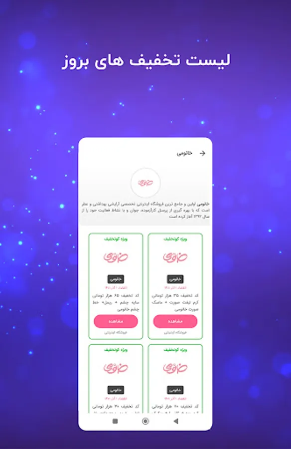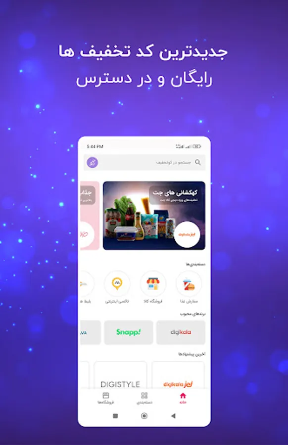 Be aware of the latest discount codes of online stores at any time by using Kutkhafif application. Kutsafif is a platform for instant introduction of discount codes for online stores. You can get discount codes for online shopping, online taxi, online food ordering, tour reservations, hotel reservations, and pool ticket purchases with a discount in the shortest possible time and with a few clicks. There is always a discount code from online stores like Digi Kala, Digi Style, Snap Market, Snap Food, Snap, and more!