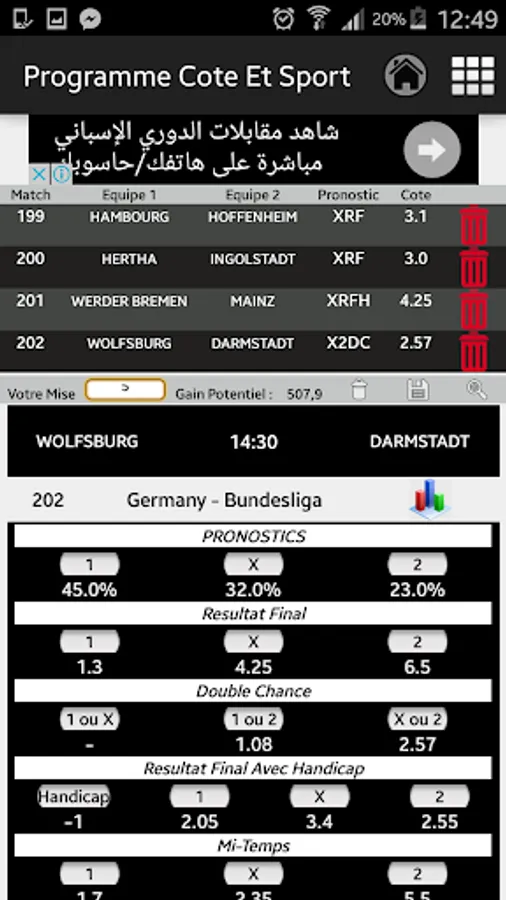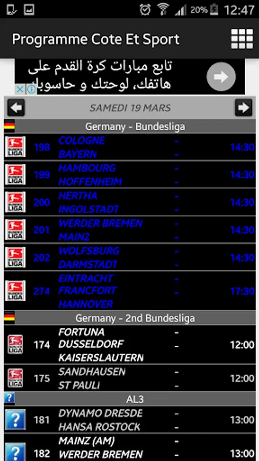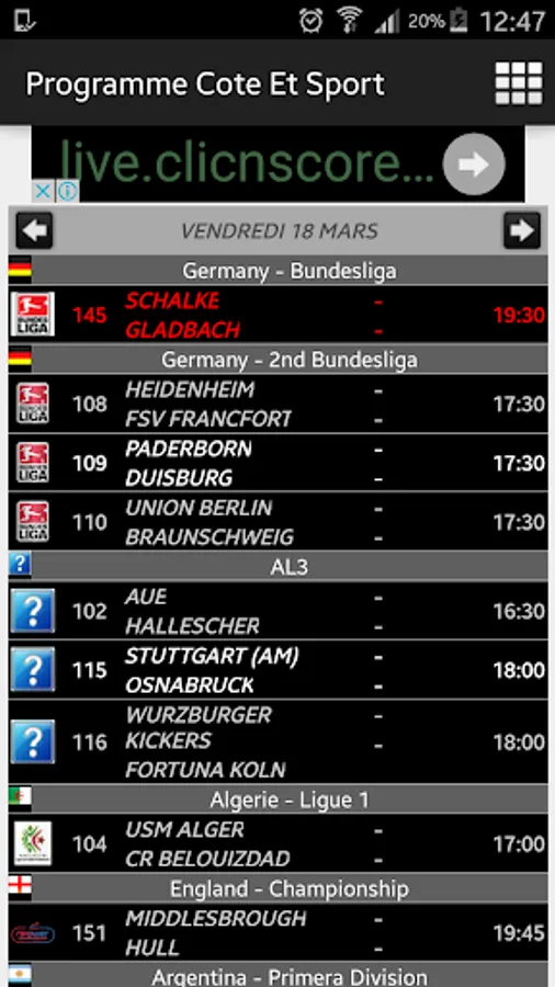 a well organized program either by DAY or by CHAMPIONSHIP and also displays the CLASSIFICATION of the teams, the TIME of the beginning, and all the COTES of the matches,