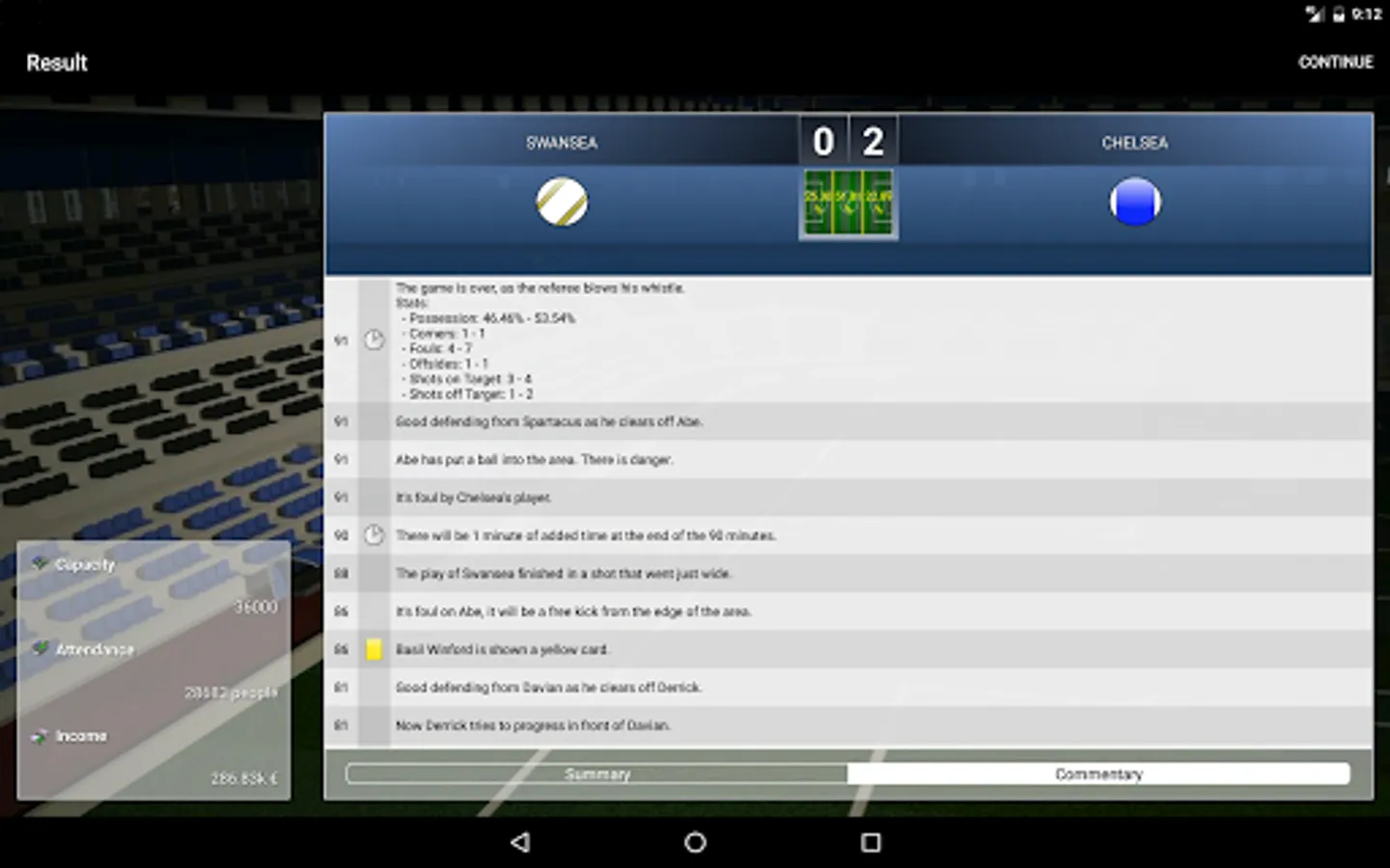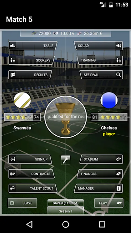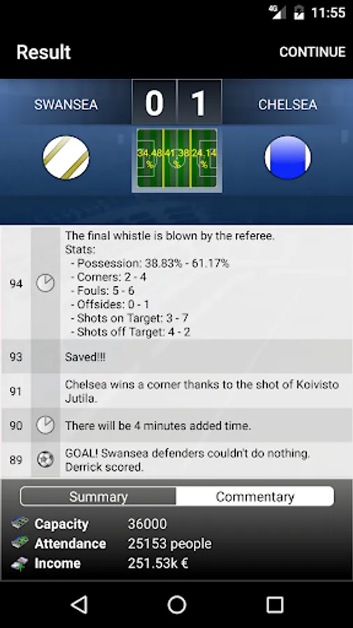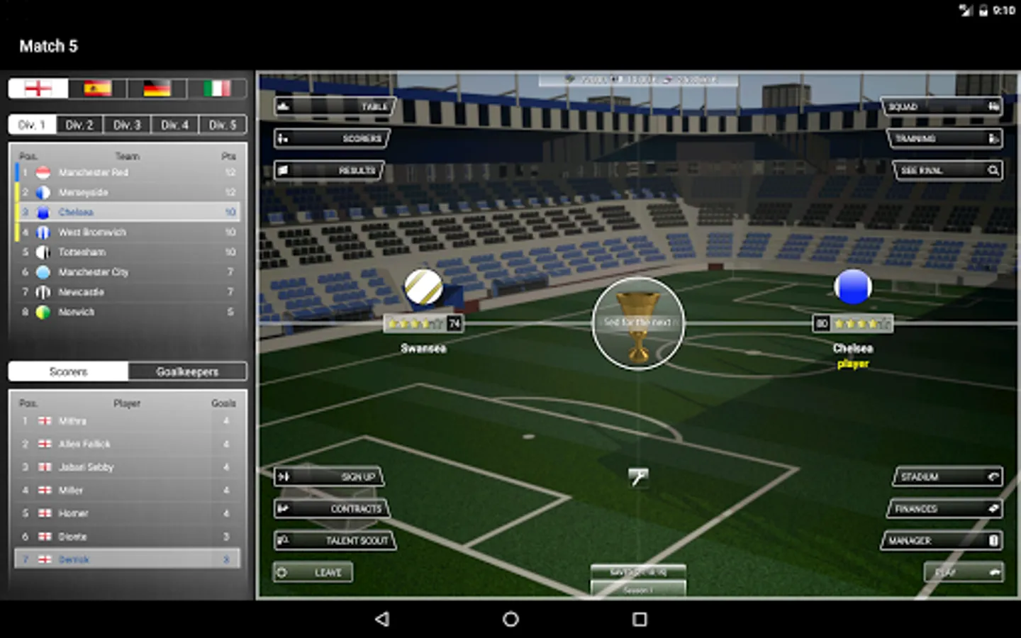 You can play the matches directly in Result mode or you can follow them instantly and make substitutions or tactical changes in the Minute-by-minute mode.