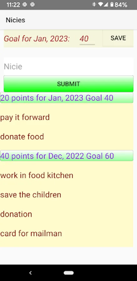 Bring out the Nicie in you! Track all the kind things your do for others. Set a monthly goal and make it happen. Nothing is shared so it is completely private, unless you show it to someone. So go ahead and be a Nicie.