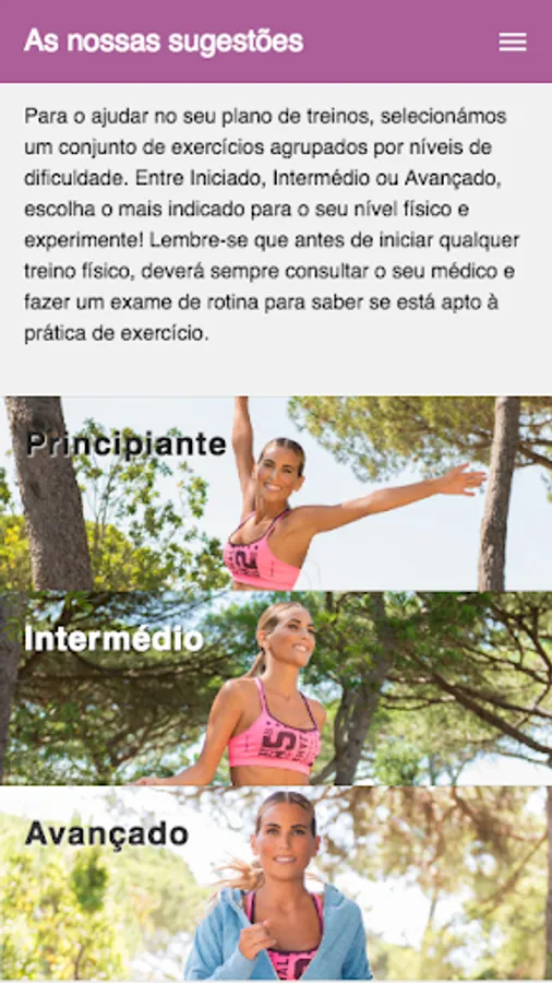In app Fit all year, you will have access to several videos of exercises performed by Liliana Santos, to make it easier to put them into practice. The exercises are divided into different areas of the body:
