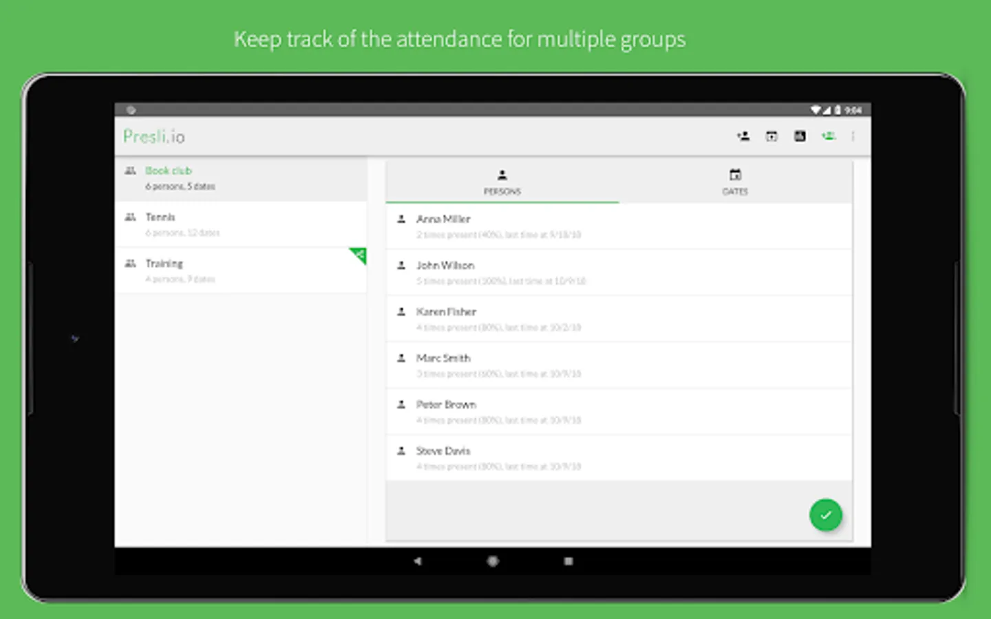 You're managing some group of persons and wants to manage the attendance? You don't need those paper lists or spreadsheets any more. Presli.io is made just for you.