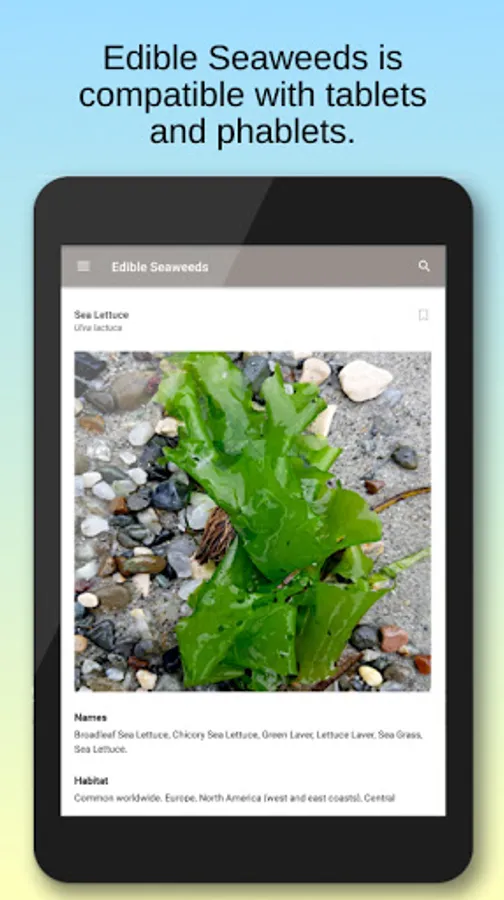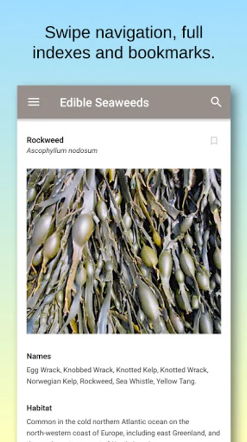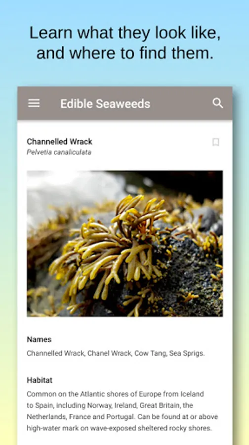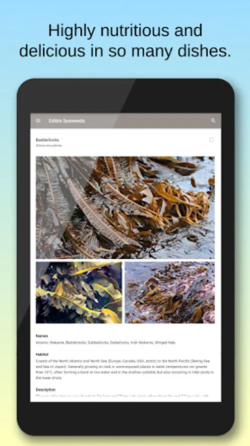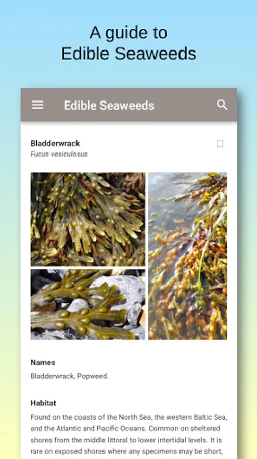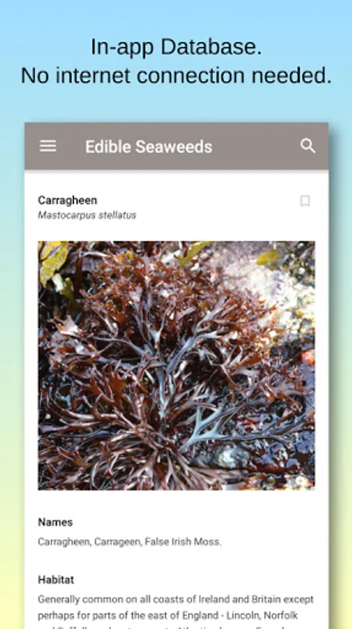 This app is designed to help you successfully identify and enjoy the edible seaweeds that are abundant on coasts and shores throughout the world. With an in-app database of commonly found seaweeds that you can eat, this app can be used as a quick and handy reference at home, or in the field as a perfect replacement for those cumbersome field guides, and all in the palm of your hand!