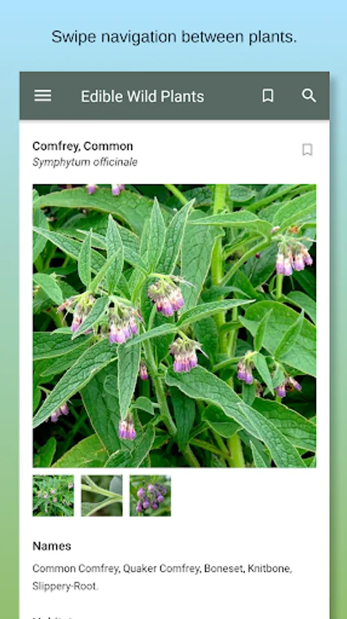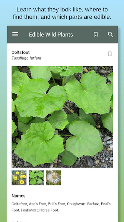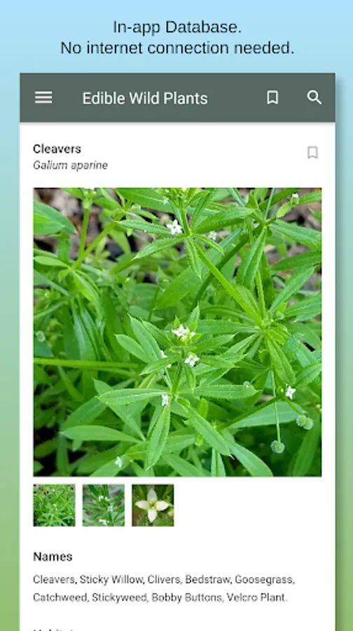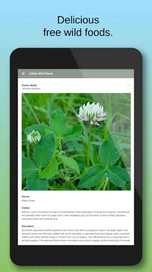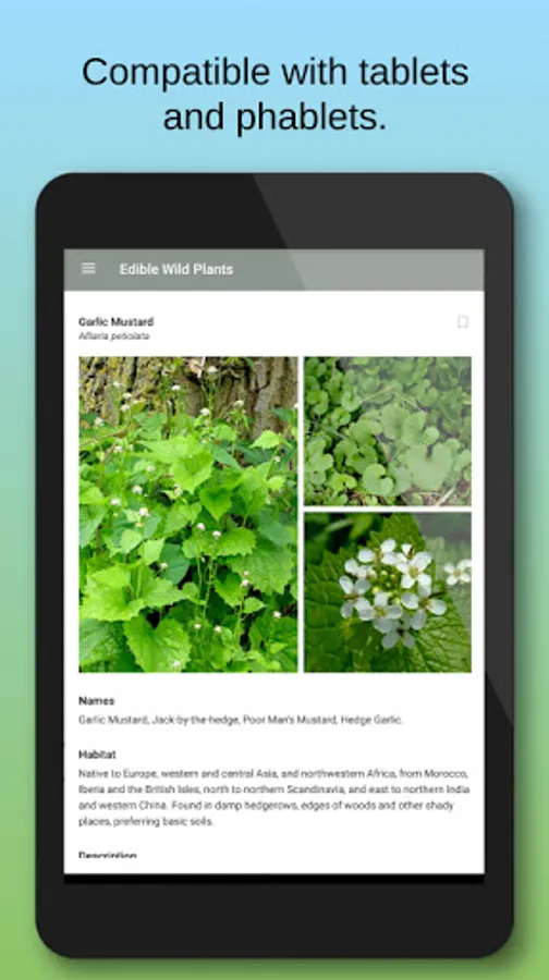 This app is designed to help you successfully identify and enjoy the edible wild plants that are abundant in the countryside and hedgerows throughout the world. With its in-app database of over 40 commonly found wild plants that you can eat, this app can be used as a quick and handy reference at home, or used in the field as a perfect replacement for those cumbersome field guides - and all in the palm of your hand!