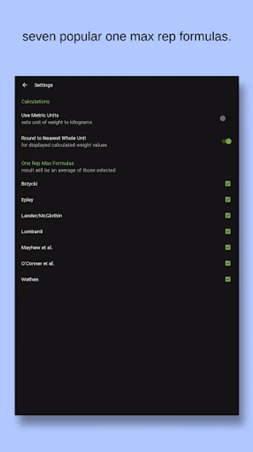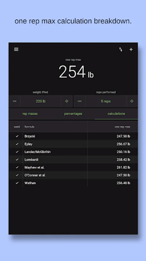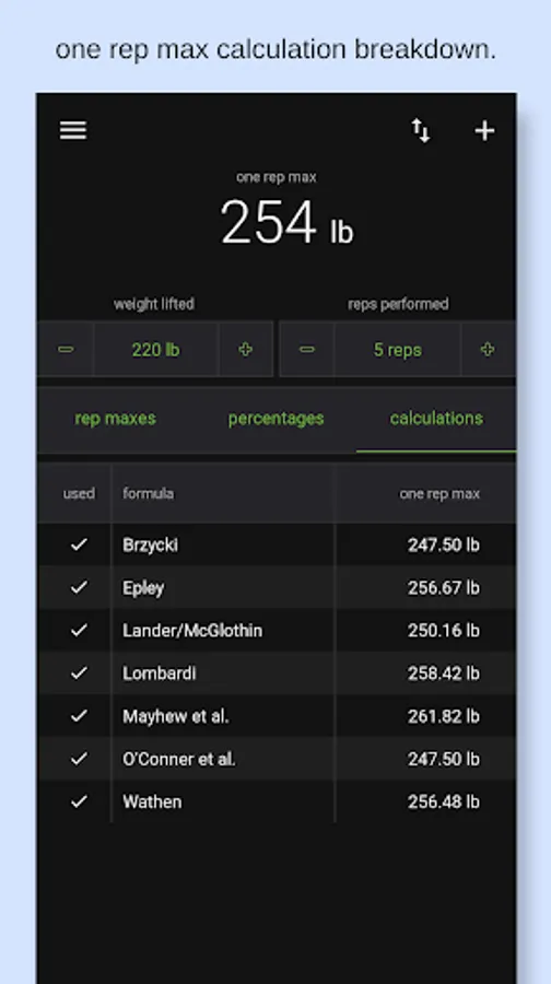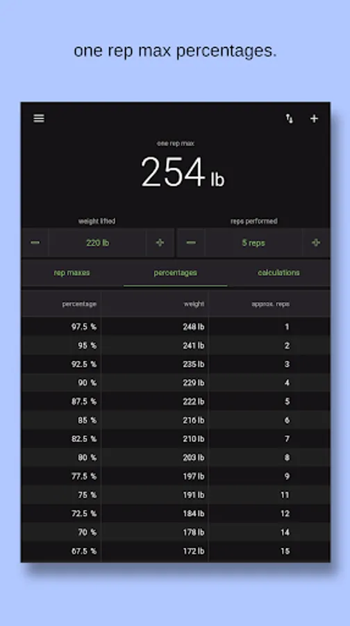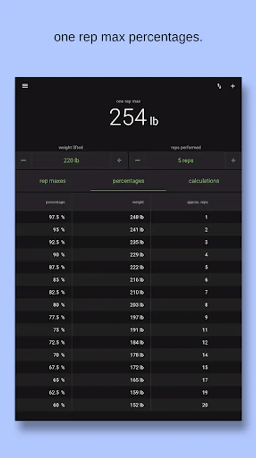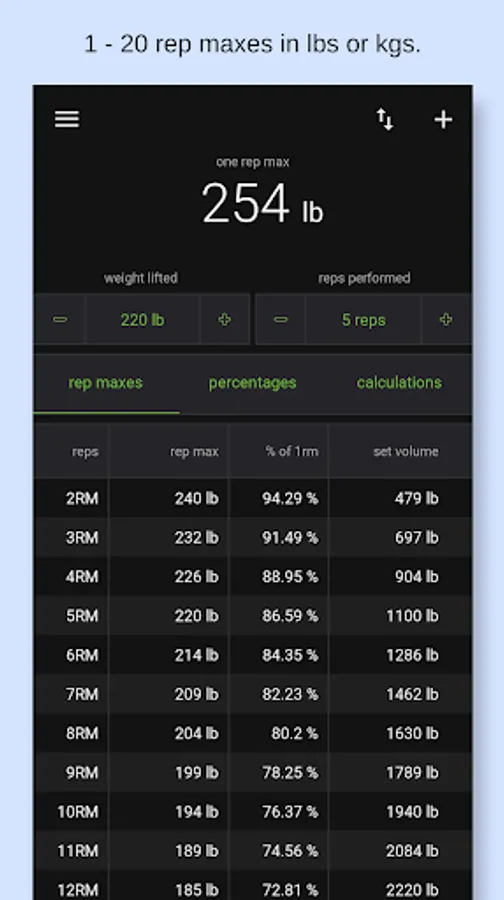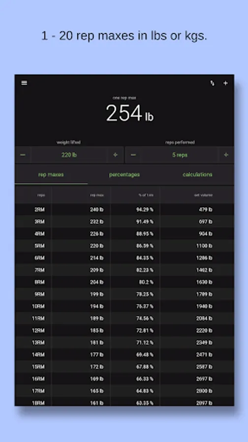 Designed for bodybuilders, powerlifters and anyone that lifts weights, this app will also calculate your 2 to 20 rep maxes, and the percentages of your 1 rep max.