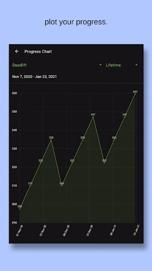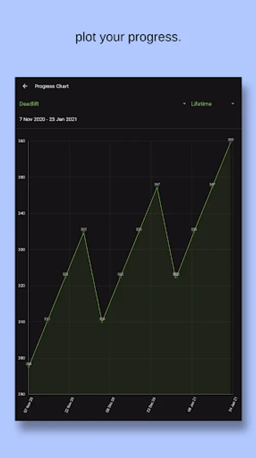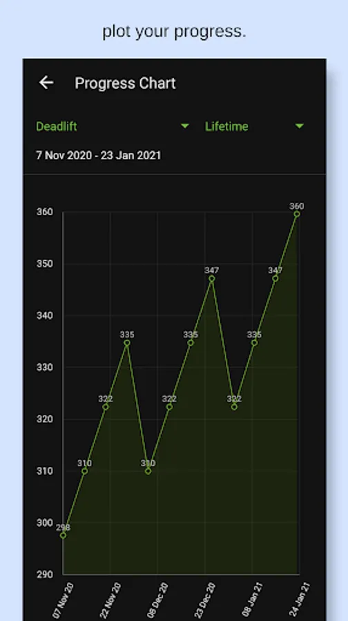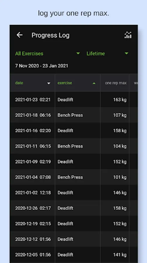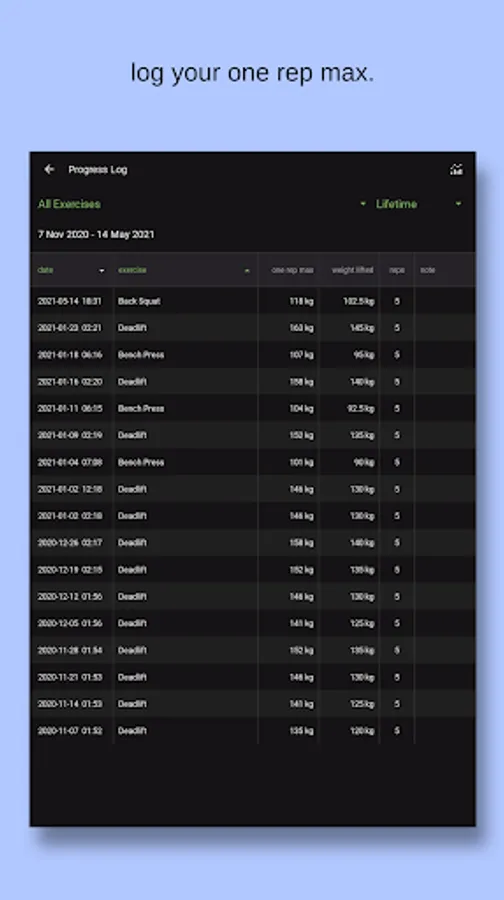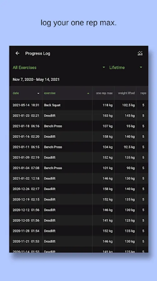 Your results can be saved to the progress log, allowing you to keep track of your 1 rep maxes, and together with the progress graph, plot your strength gains over time.