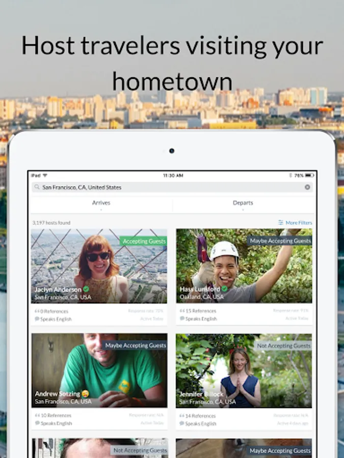 See who's nearby and wants to meet up by becoming available on Couchsurfing Hangouts! Also check out the thousands of events planned by Couchsurfers in your hometown or upcoming travel destination.